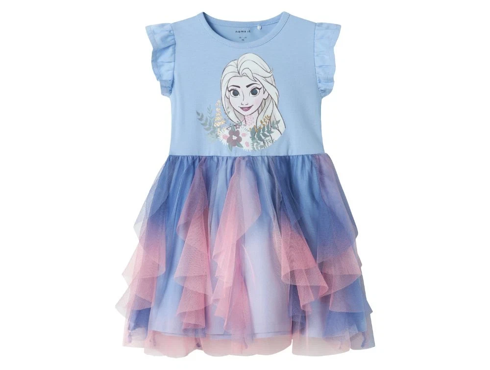 Midi kjole i blå nuance fra Name It med print af Elsa og lag-på-lag tylskørt.
