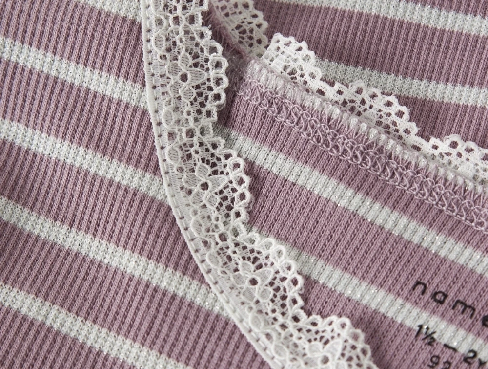 Bluse i støvet rosa nuance (toadstool) fra Name It MINI med striber og fin blondekant i halsen. En blød ribstrikket trøje med et strejf af glimmer og en behagelig pasform til hverdagsbrug.