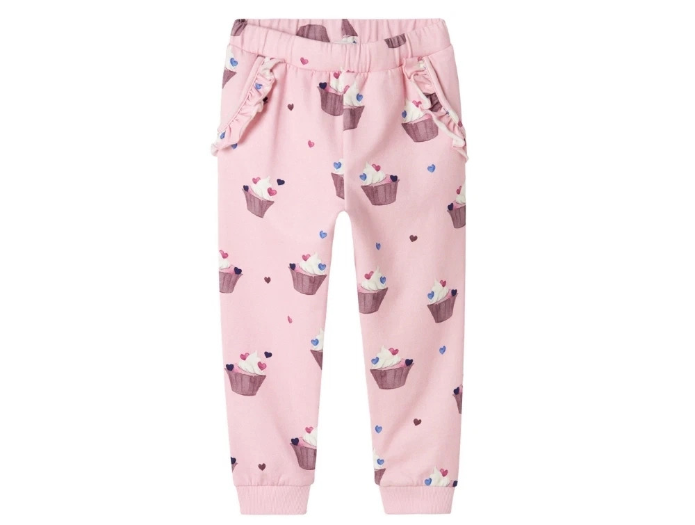 Bukser i lyserød nuance (sweet dreams) fra Name It MINI med sødt cupcakeprint og flæsedetaljer ved lommerne. En blød og behagelig model, perfekt til hverdagsbrug og leg.