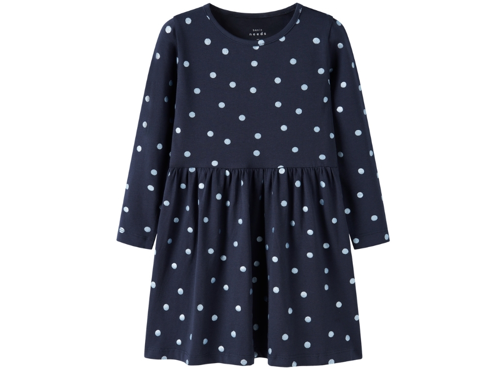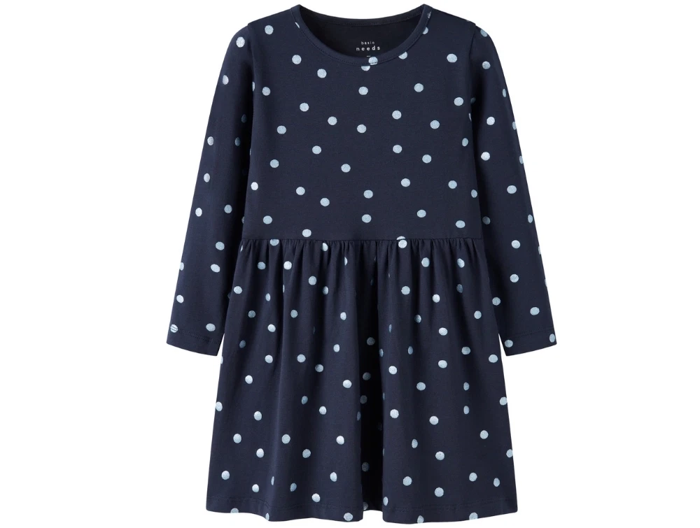Kjole i mørkeblå nuance (navy blazer) fra Name It MINI med lyseblå glimmerprikker over hele stoffet. Den bløde jerseykvalitet giver en behagelig fornemmelse og gør kjolen ideel til både leg og hverdagsbrug.