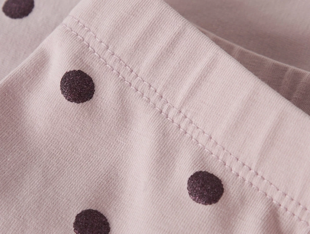 Leggings i lys lilla nuance fra Name It med fine glimmerprikker. Den bløde jerseykvalitet giver barnet frihed til at bevæge sig og gør dem behagelige til hverdagsbrug.