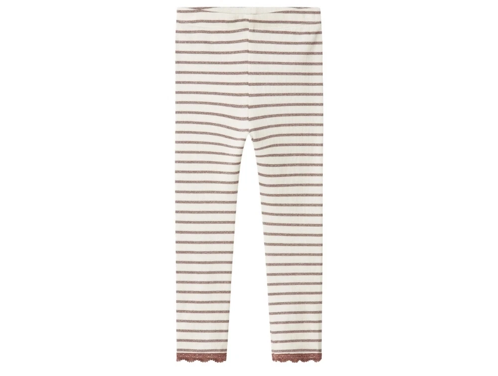 Leggings i råhvid nuance (peppercorn) fra Name It MINI med fine striber og blondekant forneden. En blød og strækbar model med et strejf af glimmer, perfekt til både hverdag og hygge.