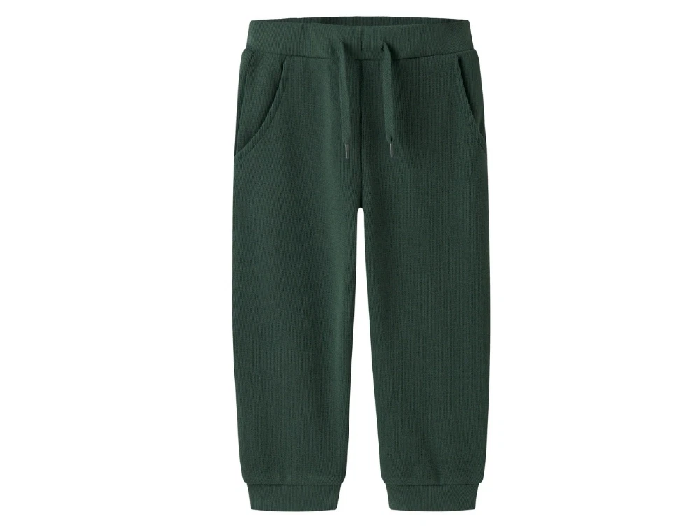 Sweatbukser i grøn nuance (garden topiary) fra Name It MINI. De har blød, ubørstet inderside og praktiske detaljer som snøre og justerbar talje, der sikrer god pasform.