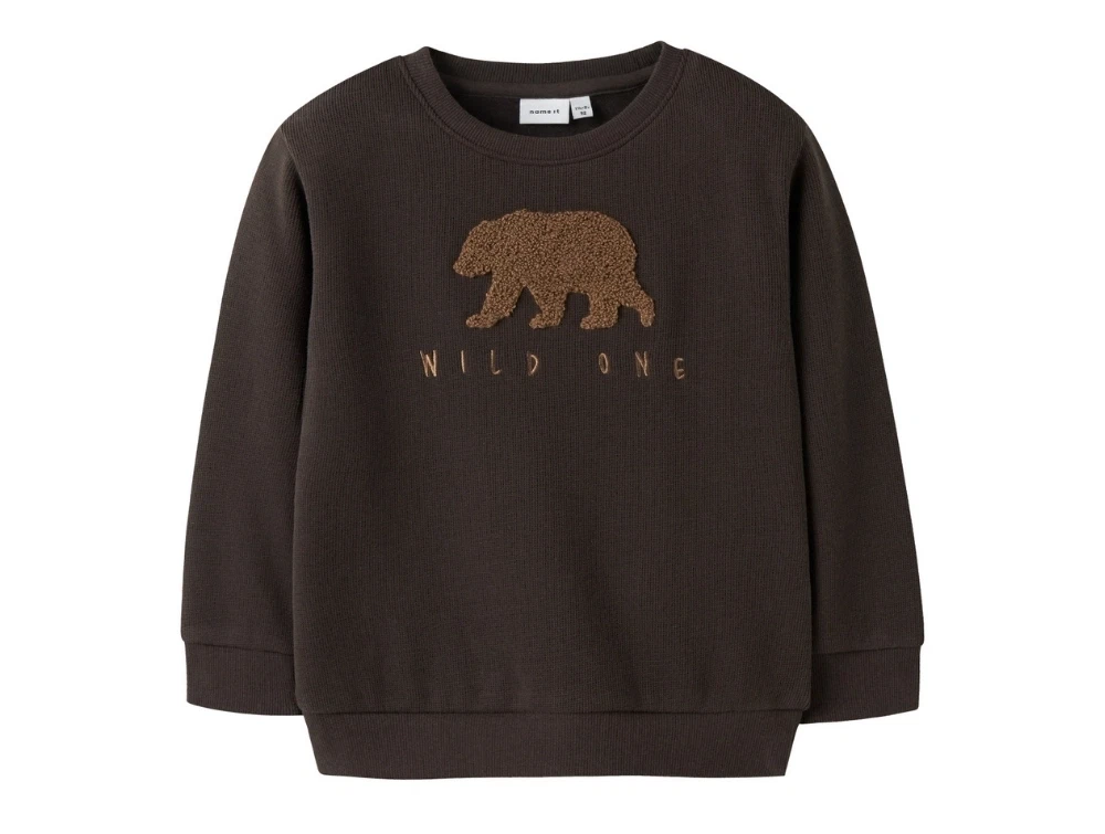 Sweatshirt i mørkebrun nuance (delicioso) fra Name It MINI med flot 3D-broderi af bjørn og teksten "WILD ONE". En blød og behagelig trøje, der kombinerer et sejt udtryk med hverdagskomfort.