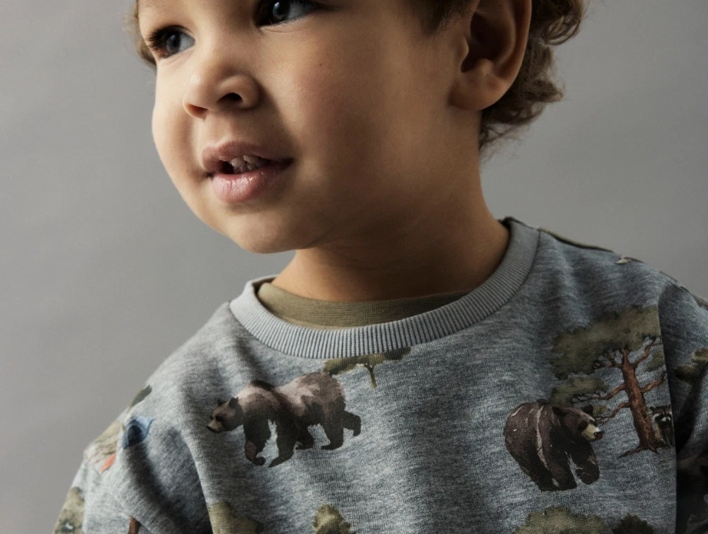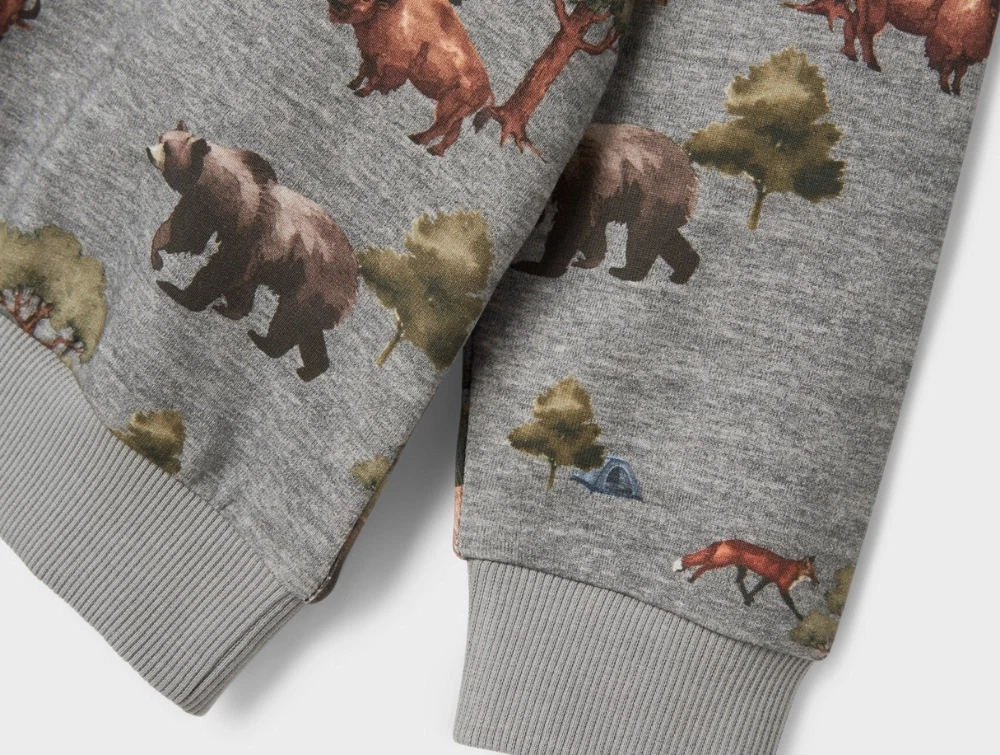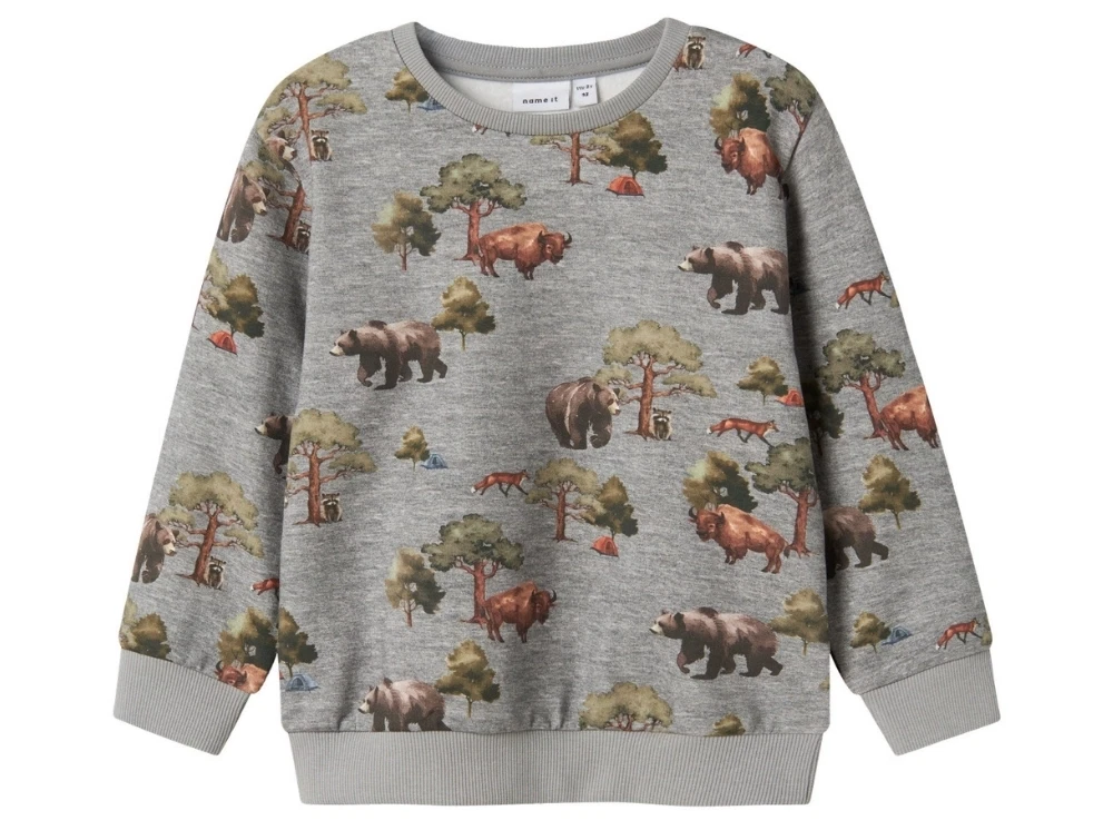 Sweatshirt i grå meleret nuance (grey melange) fra Name It MINI med print af skovdyr som bjørn, ræv og bison. En blød og varm trøje i børstet sweatkvalitet, perfekt til efterår og vinter.