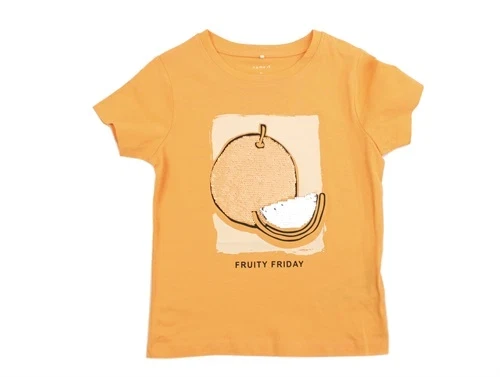 T-shirt i farven mock orange med appelsinprint og tofarvede palietter fra Name It.