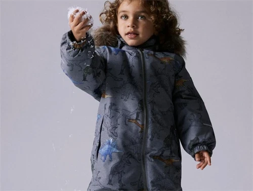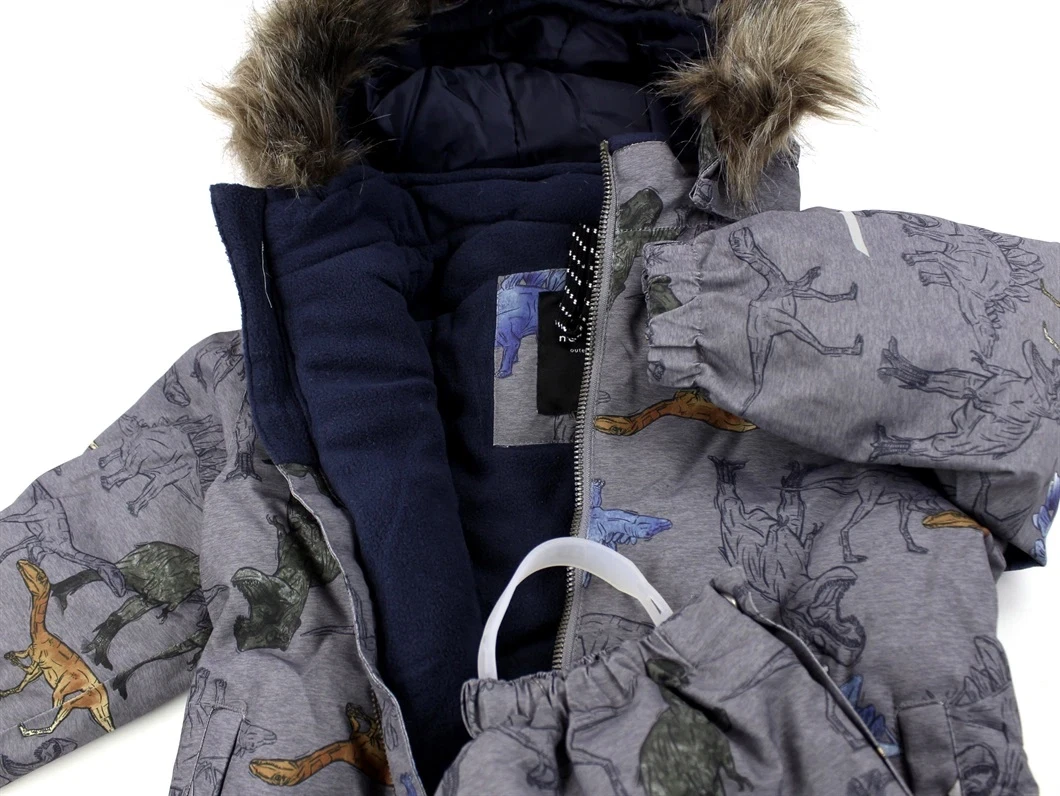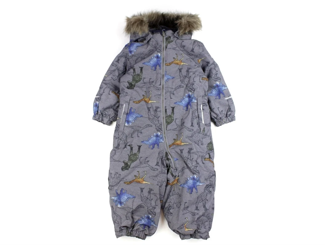Flyverdragt i farven mockingbird med dino-print fra Name It. Flyverdragten har en aftagelig hætte med faux fur og trykknapper.