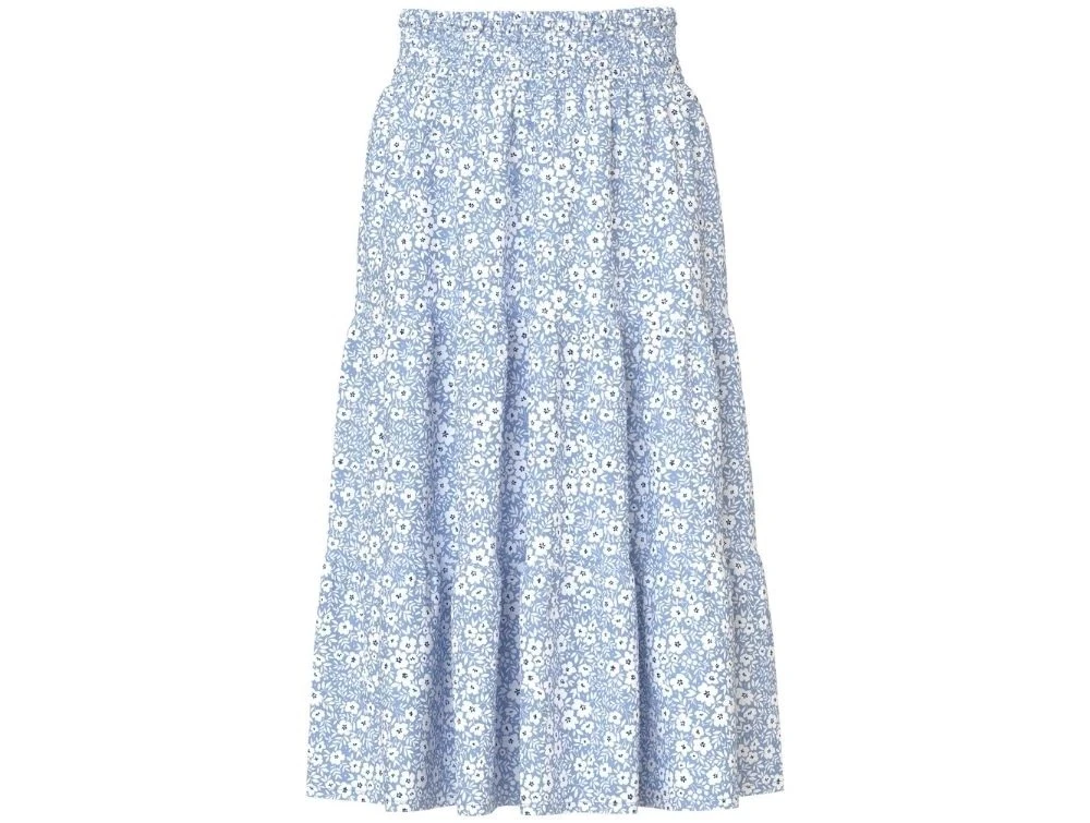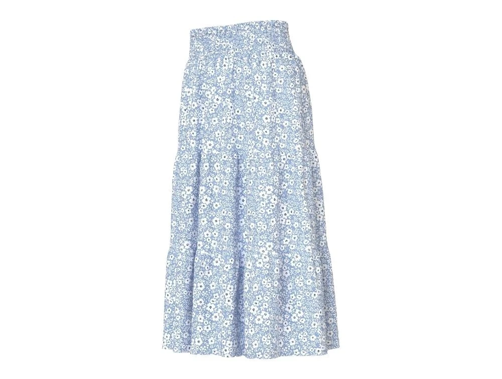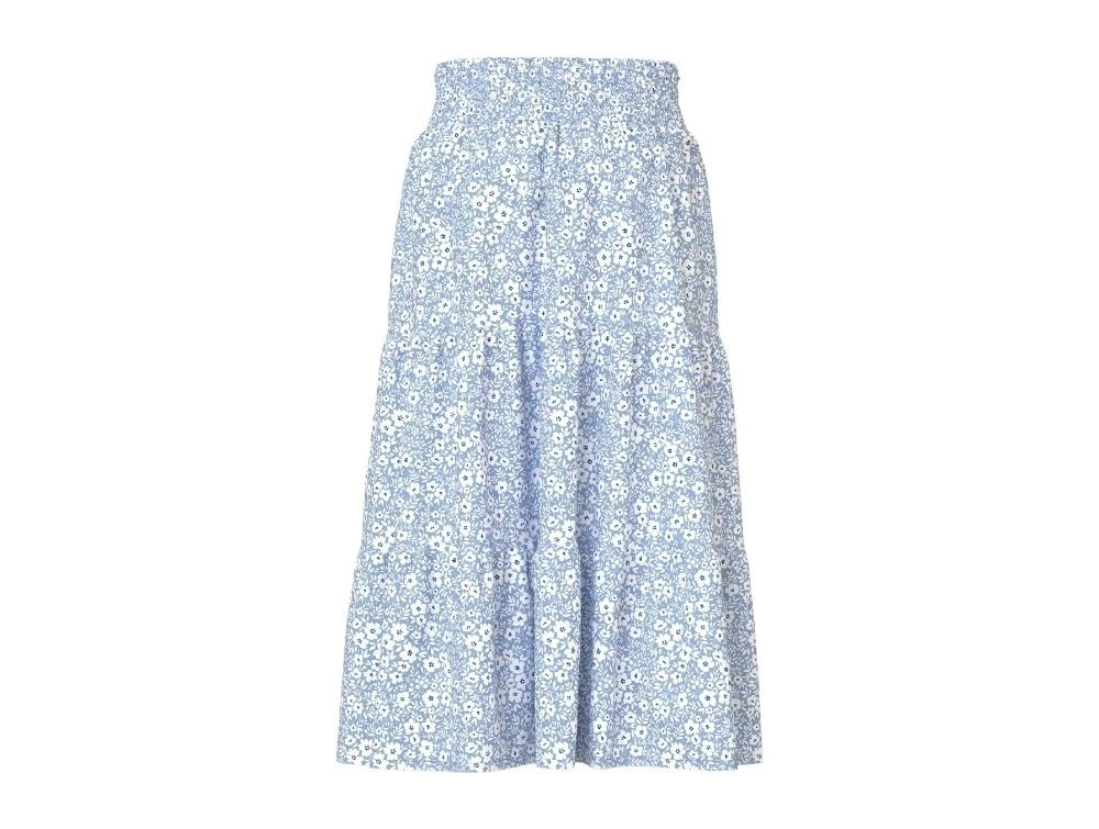 Lang blomsternederdel fra Name It i lyseblå vævet kvalitet med hvidt blomsterprint og elastisk talje.