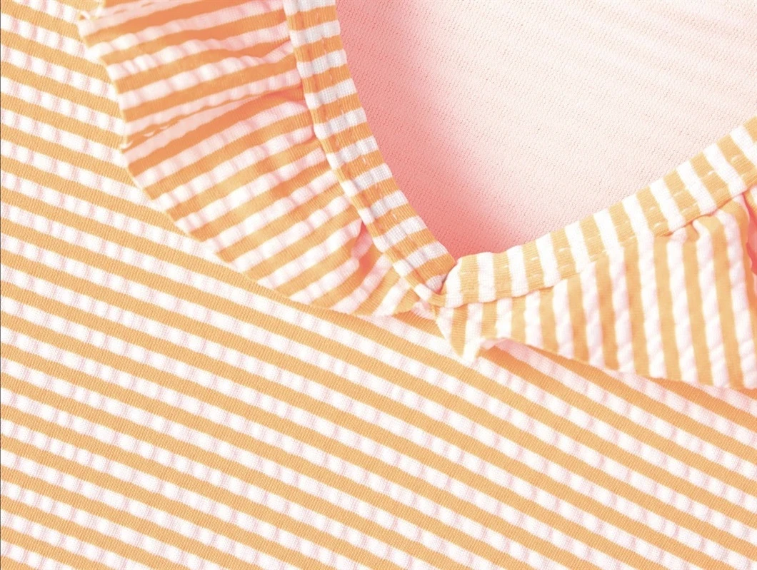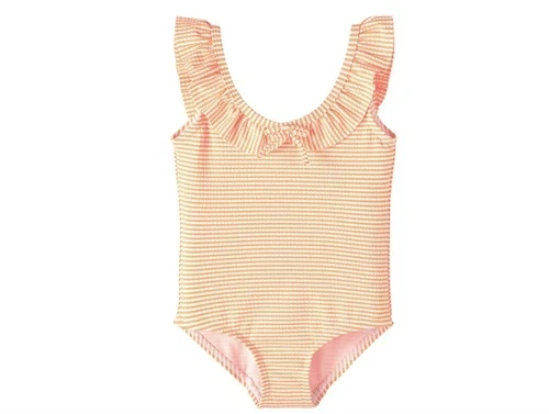 Badedragt i farven orange pop med striber, flæser og lille sløjfe fra Name It.