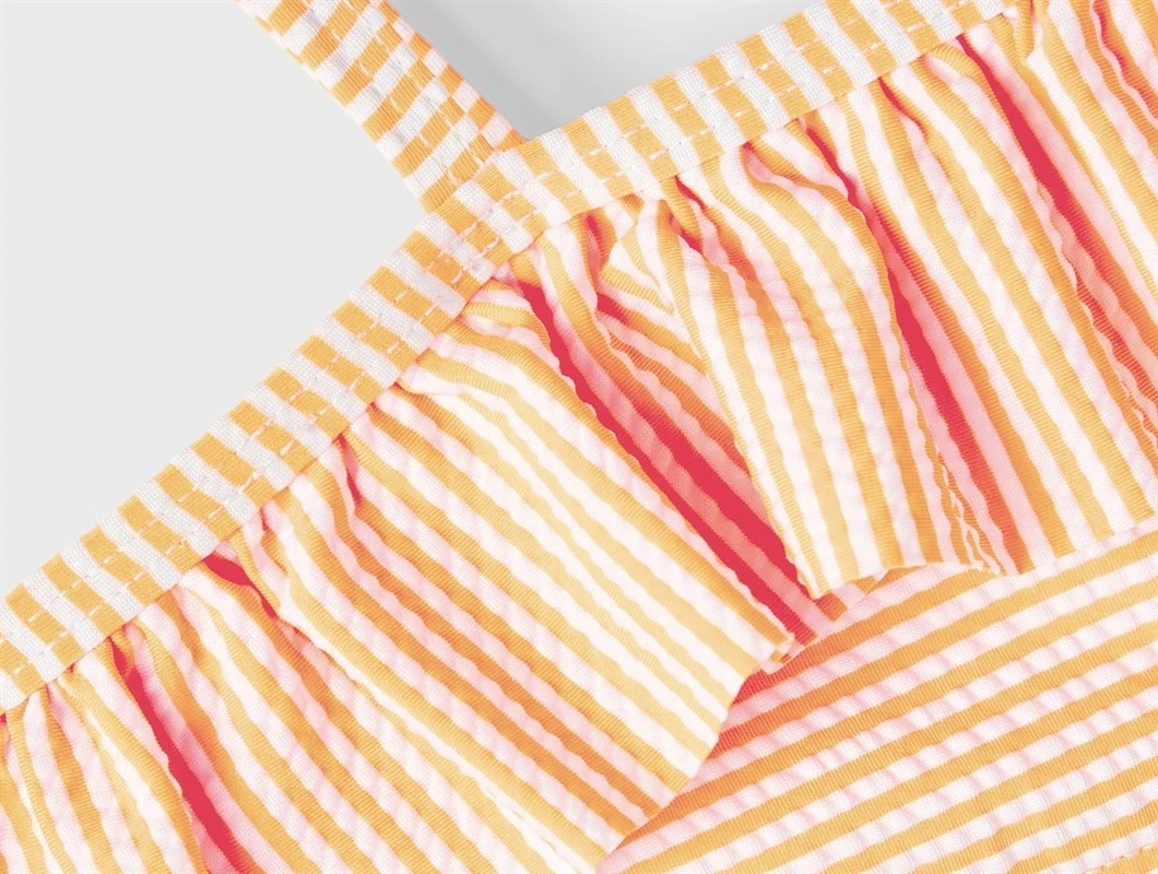Bikini i farven orange pop i striber og one-shoulder med flæse fra Name It.