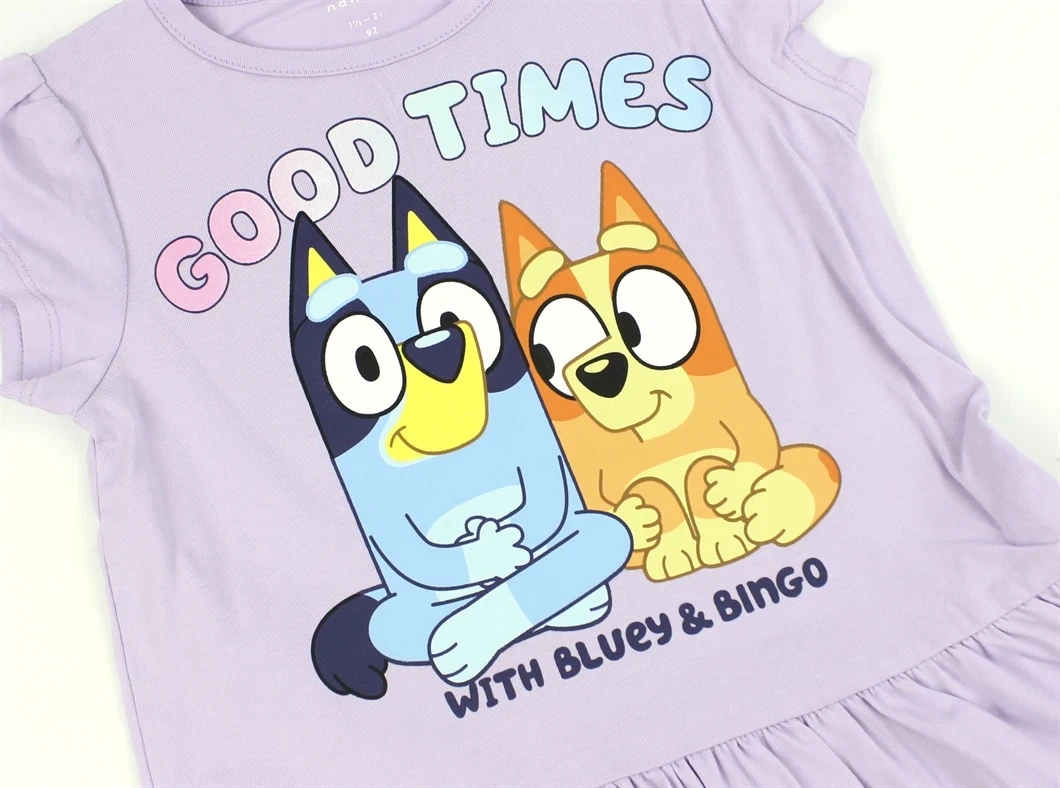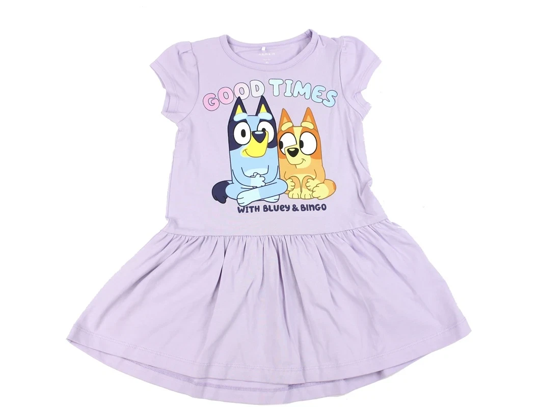 Kjole i farven orchid petal med Bluey-print og små rynker ved ærmet fra Name It.