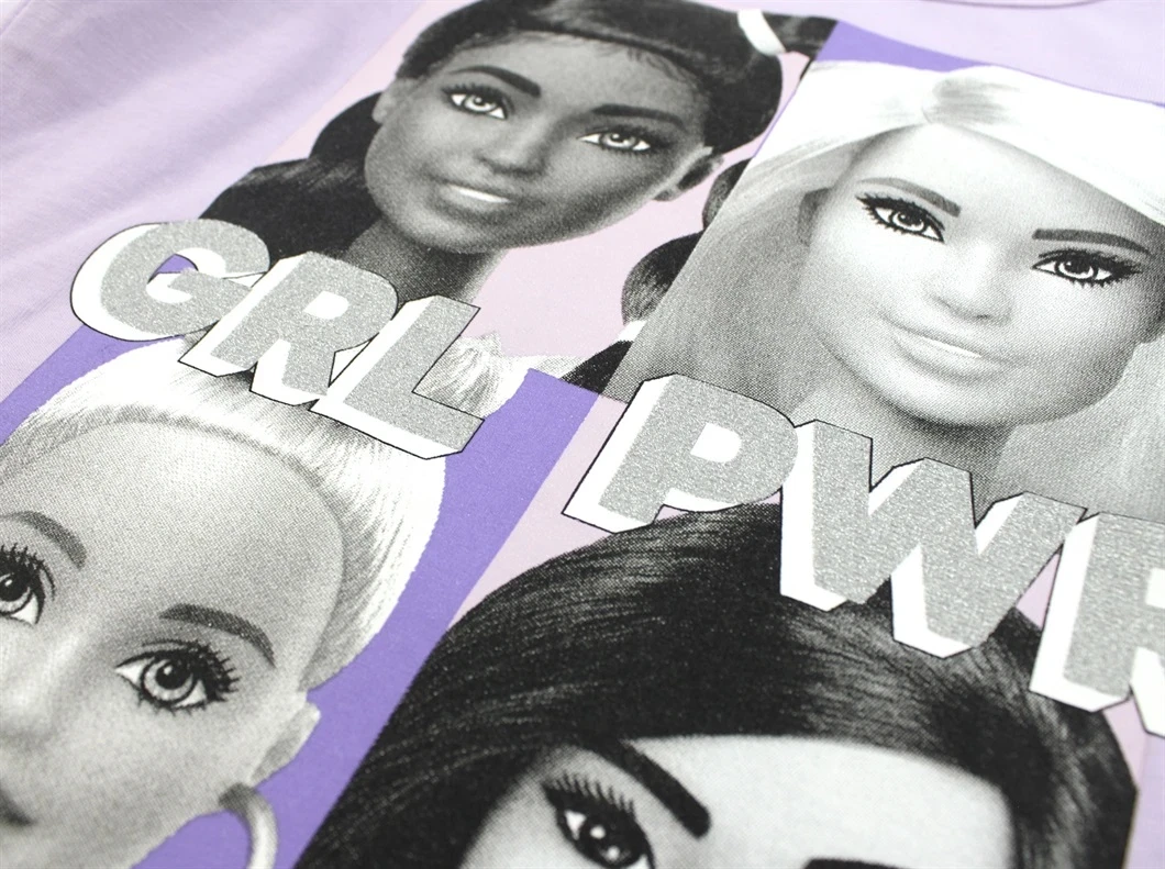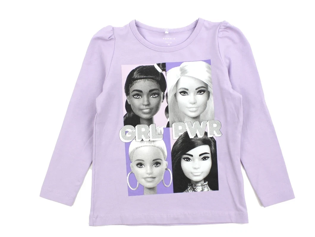 Langærmet t-shirt i farven orchid petal med Barbie-print og glimmer fra Name It.