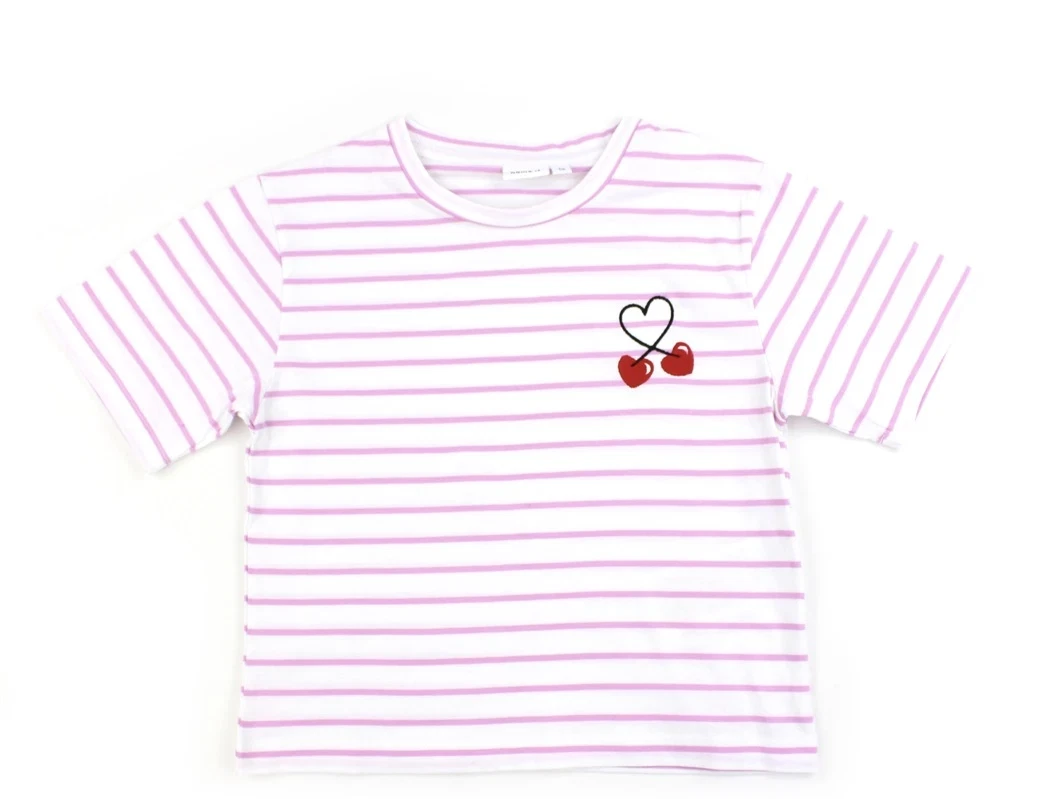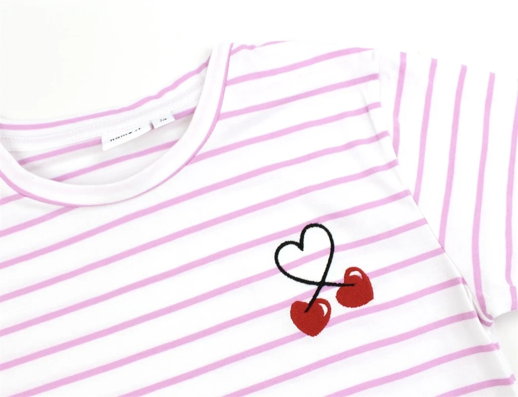 Stribet t-shirt i farven orchid med emblem fra Name It.