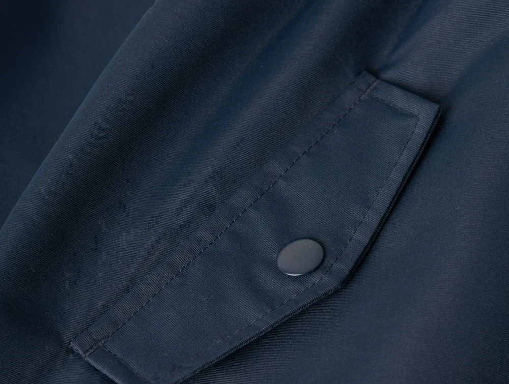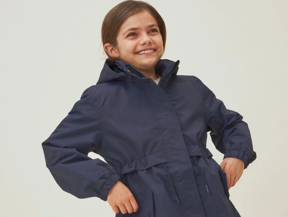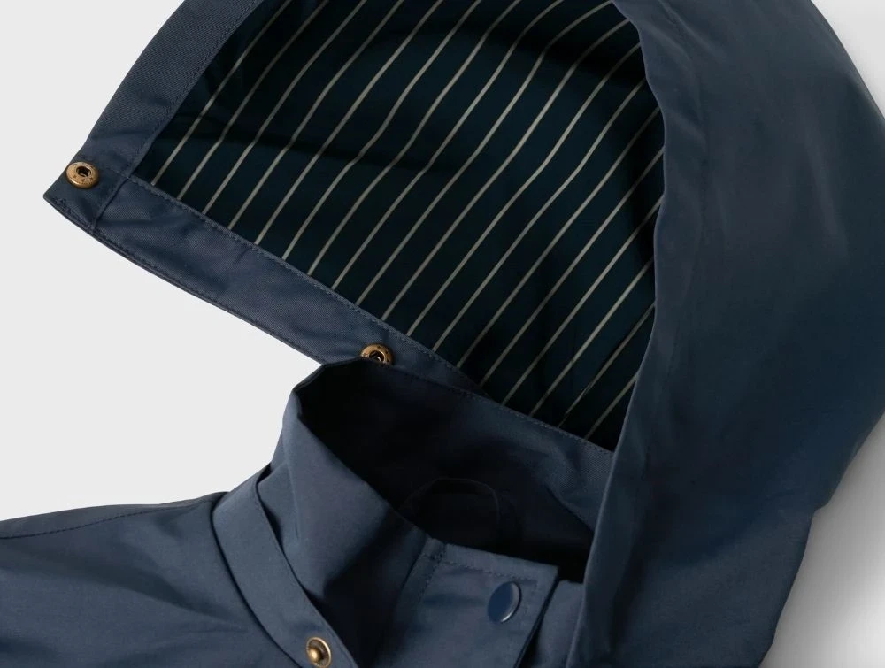Jakken har to lommer, aftagelig hætte og lukkes med lynlås.