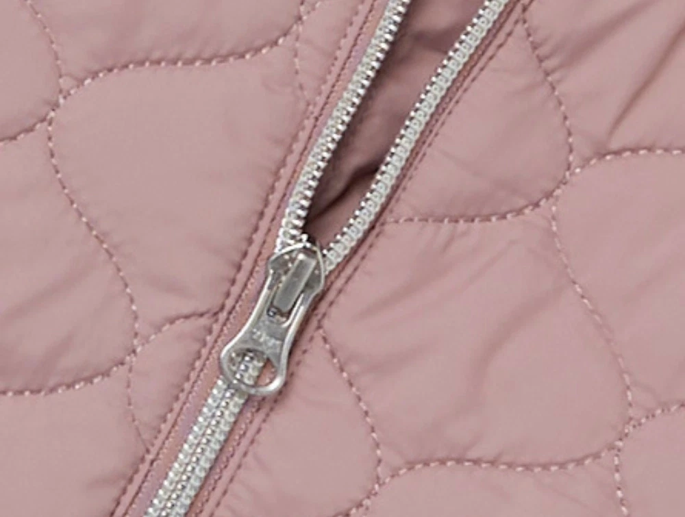 Jakken har to lommer, ribkanter ved hals og hænder og lukkes med lynlås.
