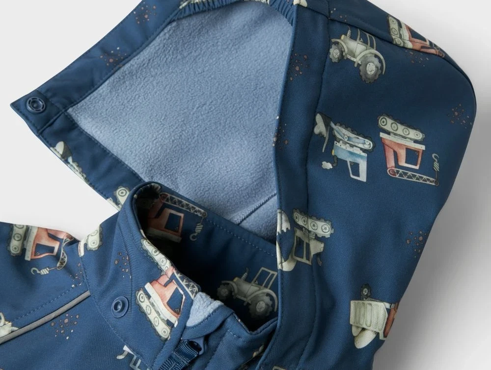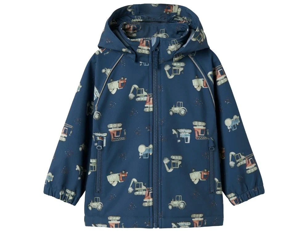 Softshell overgangsjakke i blå (sargasso sea) med print af forskellige køretøjer fra Name It.