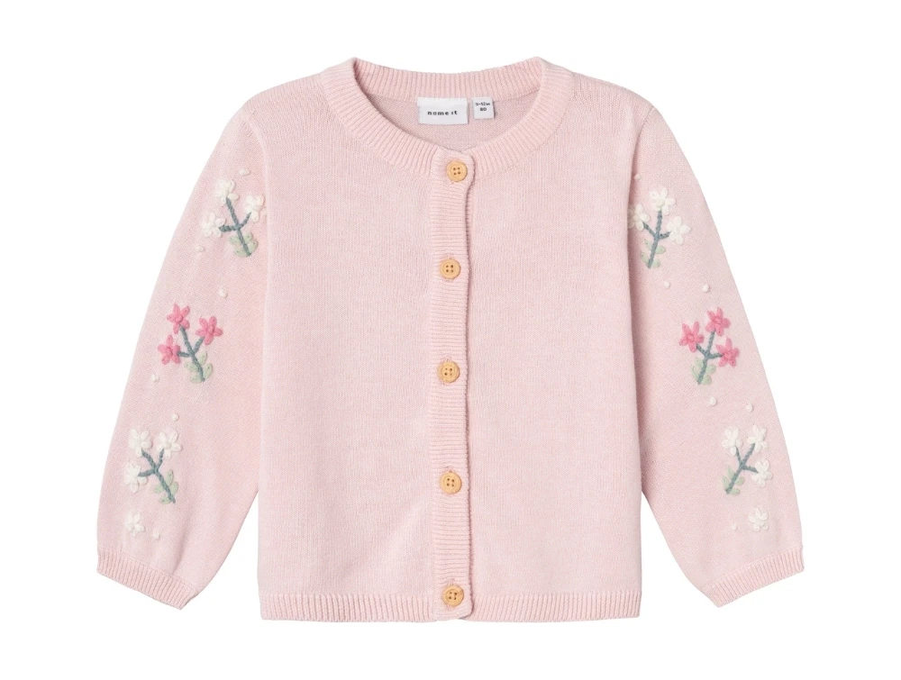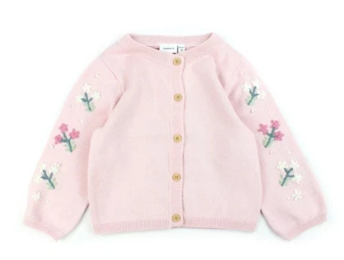 Strikcardigan i farven parfait pink med blomsterbroderi fra Name It.