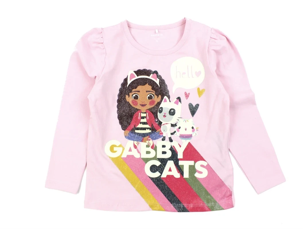 Langærmet t-shirt i farven parfait pink med glitterprint af Gabby's Dukkehus fra Name It.