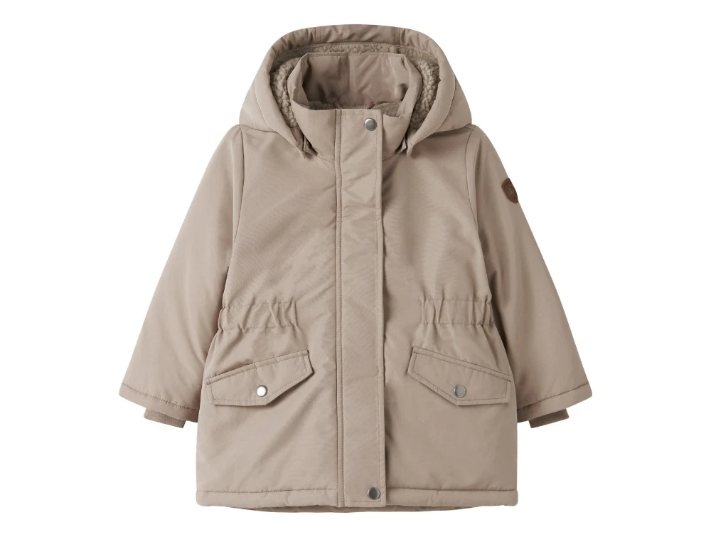 Name It parka vinterjakke i lys brun nuance (silver mink) med blødt teddyfor i den øverste del og hætten.