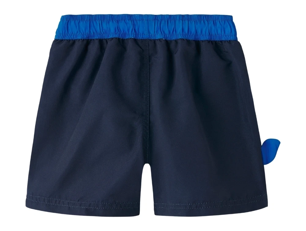 Badeshorts i mørkeblå nuance (Navy Blazer) fra Name It med stort Paw Patrol motiv på benet med figurerne Chase og Marshall.