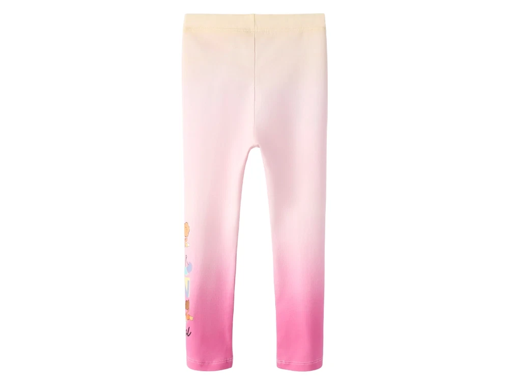 Leggings i lyserød nuance (pirouette) fra Name It med Paw Patrol print på benet og farveforløb fra lys til mørkere pink ved benafslutningen.