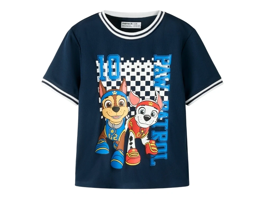 T-shirt i mørkeblå nuance (Navy Blazer) fra Name It med stort Paw Patrol print på brystet med figurerne Chase og Marshall.