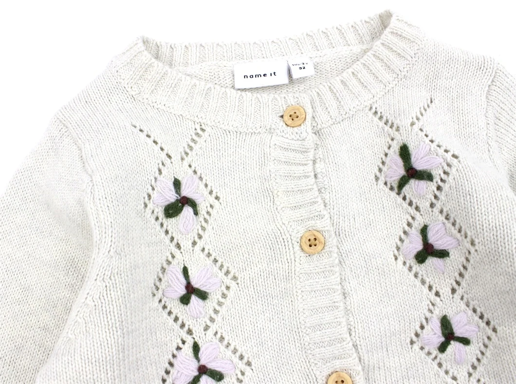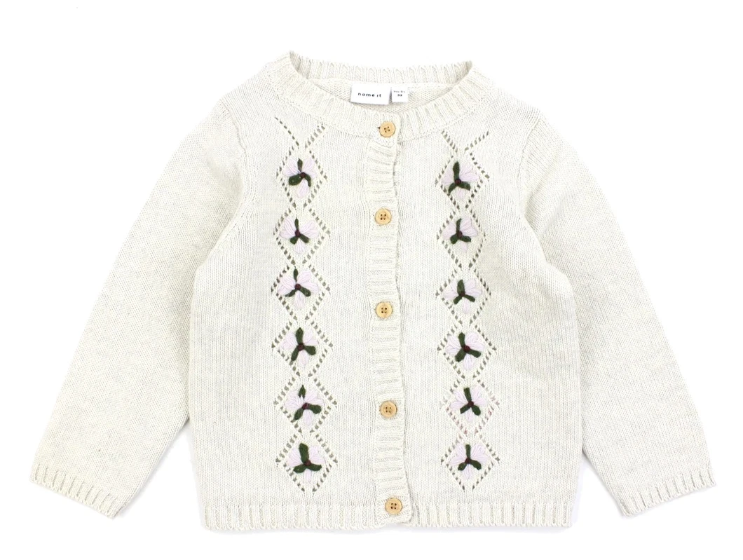 En særlig sød detalje ved denne cardigan er de broderede blomster-element.