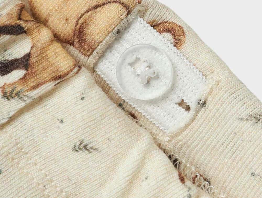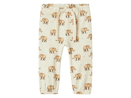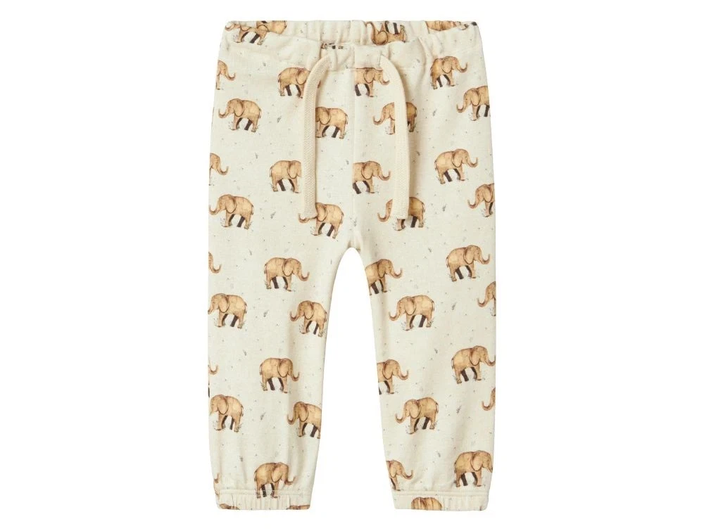 Babybukser i farven peyote melange med elefantprint fra Name It. Justerbar elastik i taljen. De er lavet af 57% økologisk bomuld, 38% TENCEL Lyocell og 5% elastan, hvilket giver en dejlig blød kvalitet. Maskinvaskes ved 40°.