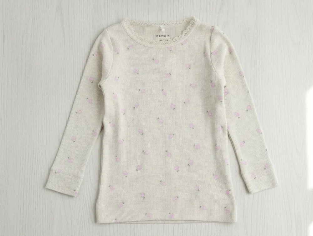 Blusen er lavet i en blød rib kvalitet i 57% økologisk bomuld, 38% modal, 5% elastan. Blusen har en fin blondekant ved halsåbningen og en klassisk rund halsudskæring.