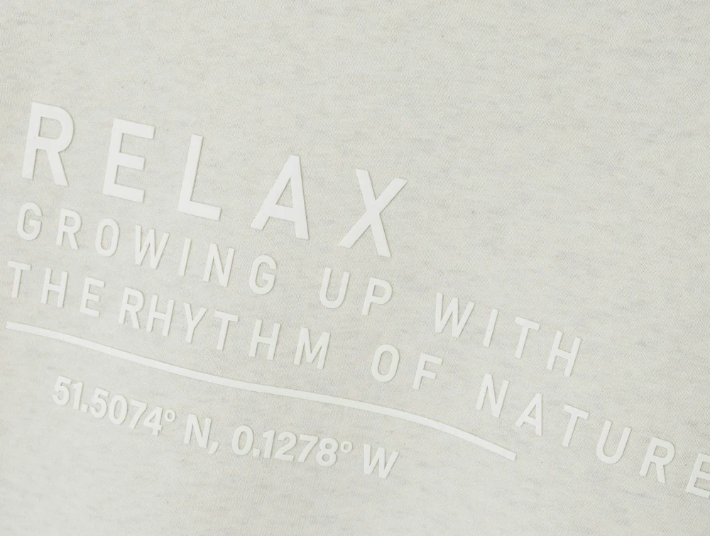 Sweatshirten har et svagt hvidt tekstprint øverst på ryggen.