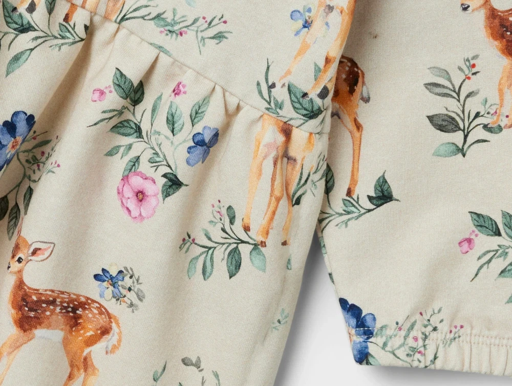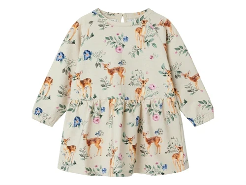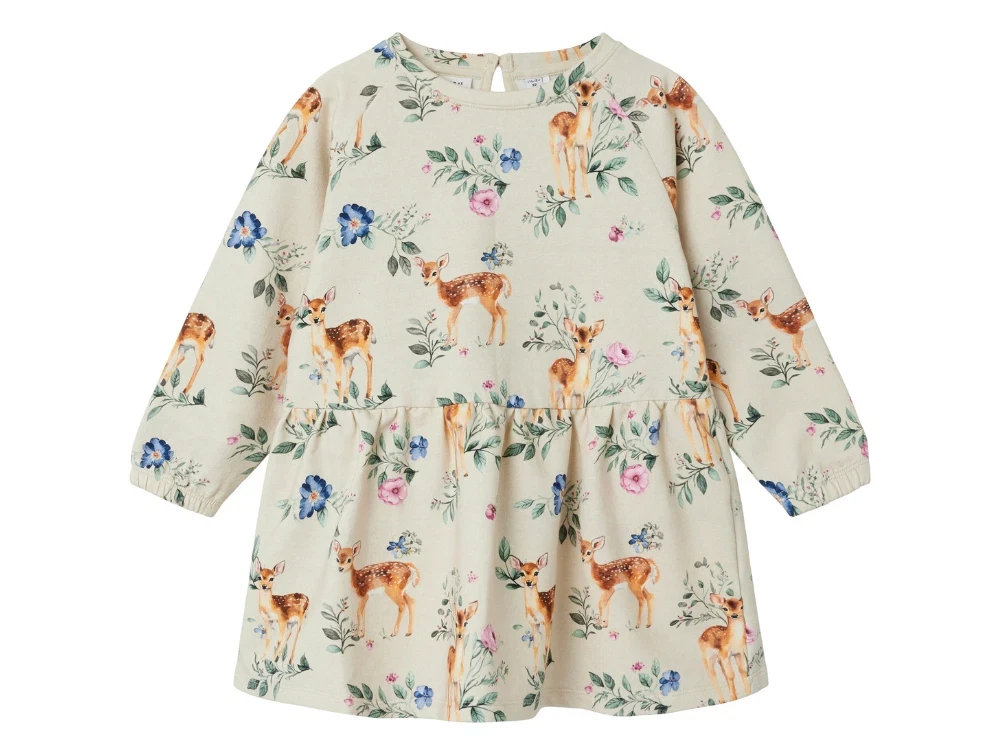 Sweatkjole i farven peyote melange med blomster og dådyr fra Name It.