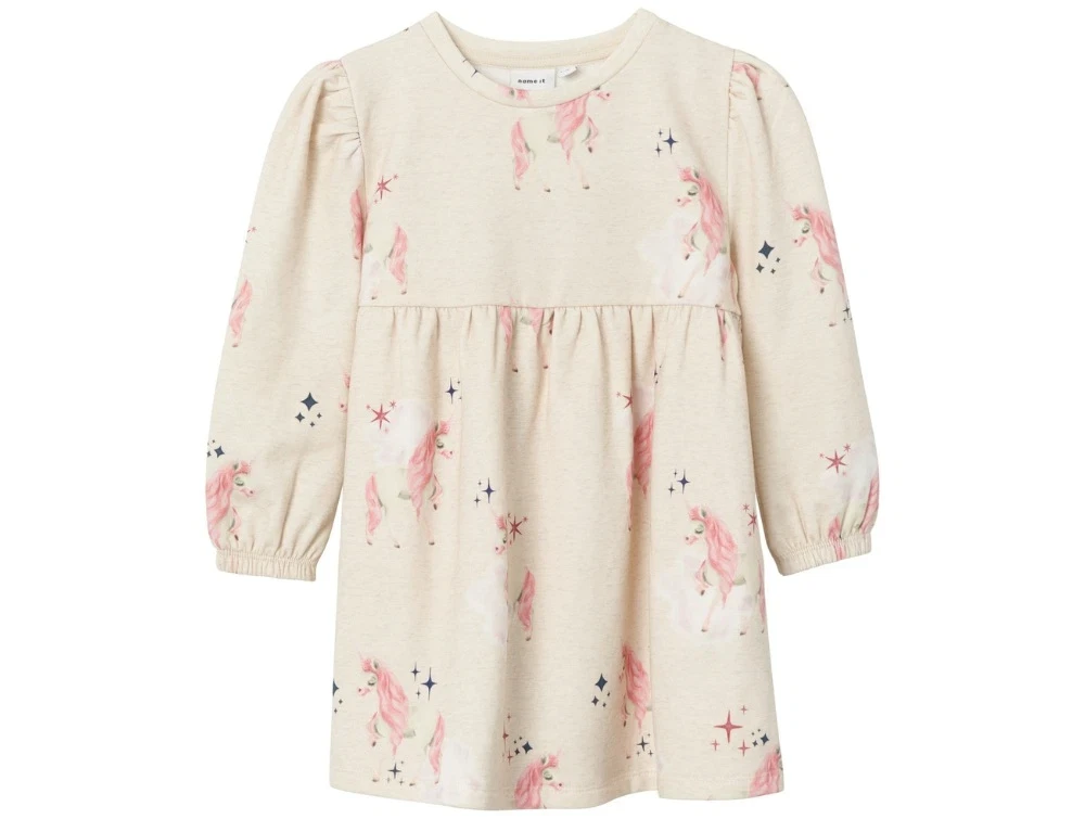 Sweatkjole i farven peyote melange med enhjørningprint fra Name It.