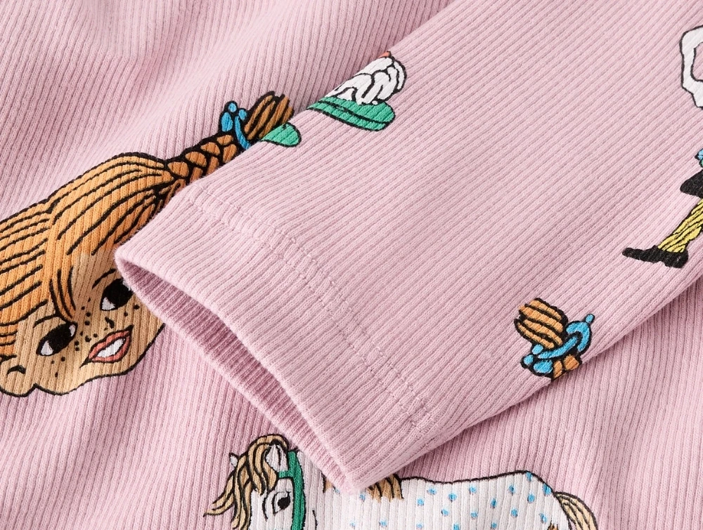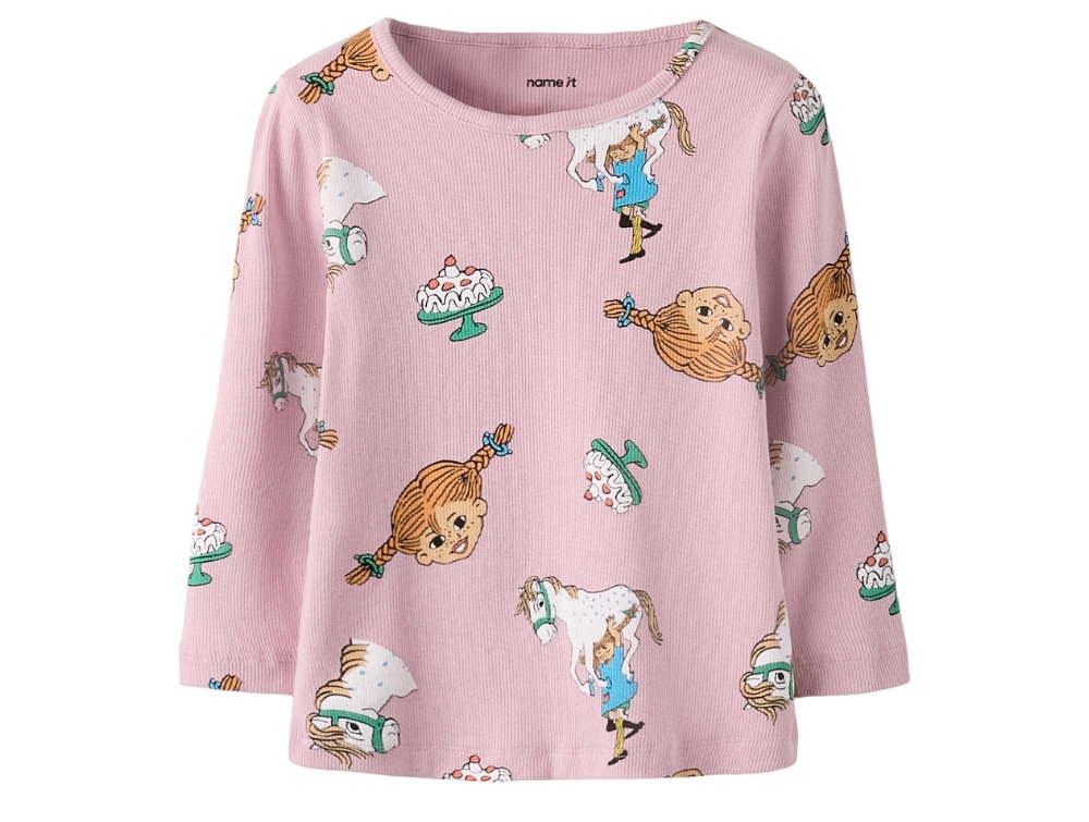 Langærmet bluse i lyserød nuance fra Name It med sjovt Pippi Langstrømpe print. En blød og strækbar ribbluse i jerseykvalitet, perfekt til leg og hverdagsbrug.