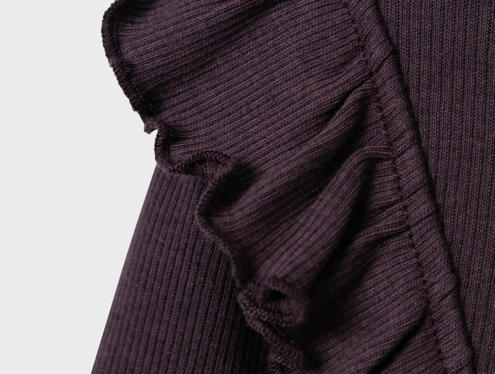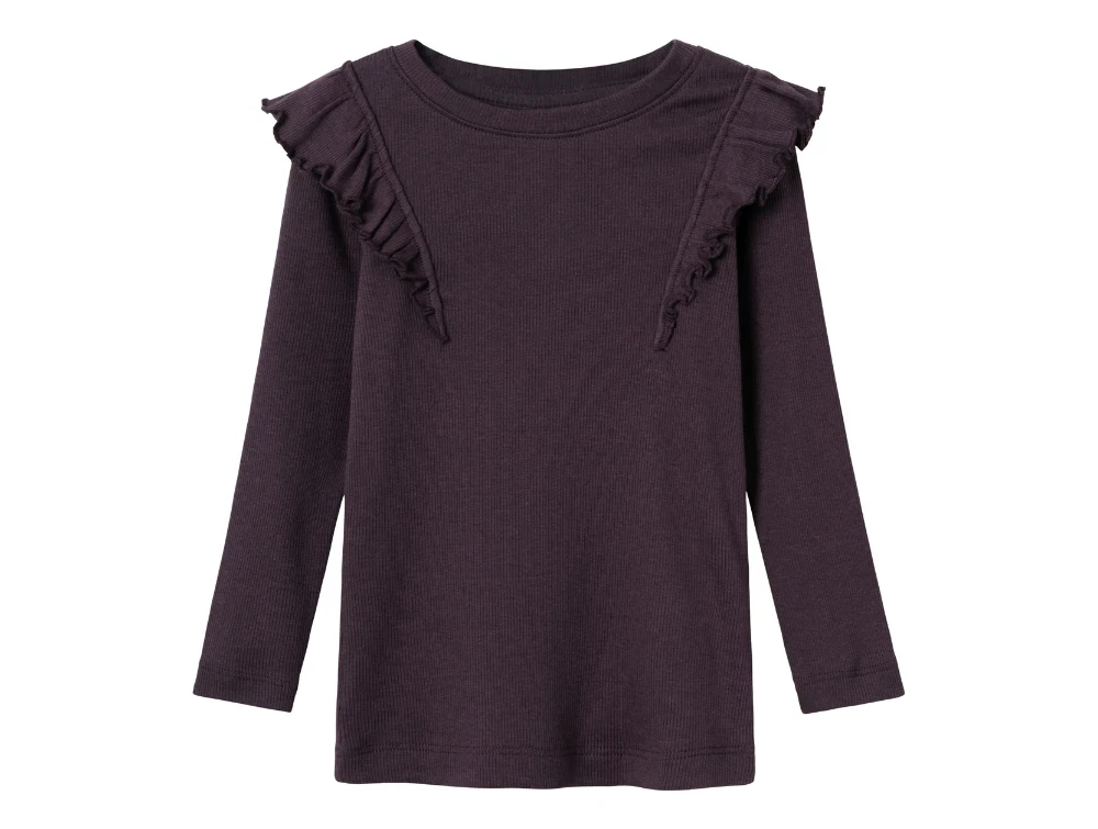 Langærmet top/bluse i farven plum perfect med flæser fra Name It.