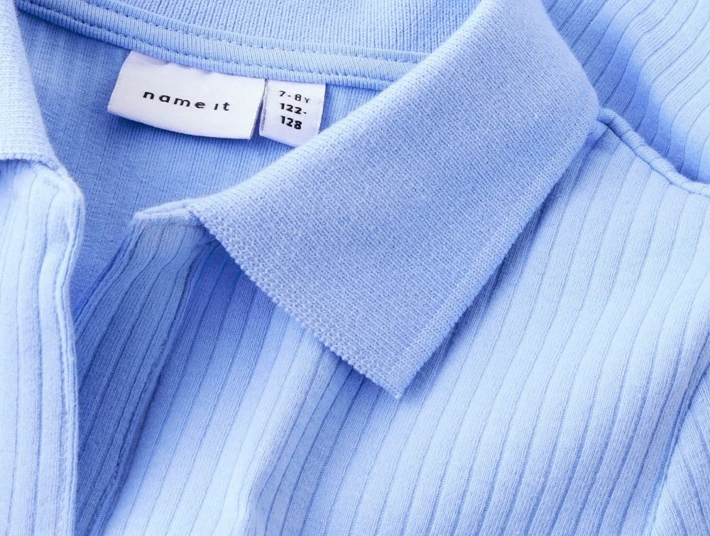 name it polo-shirt i lyseblå med krave og ribstruktur, set forfraname it polo-shirt i lyseblå med rib og krave, set bagfranærbillede af krave og ribstruktur på lyseblå polo-shirt fra name it