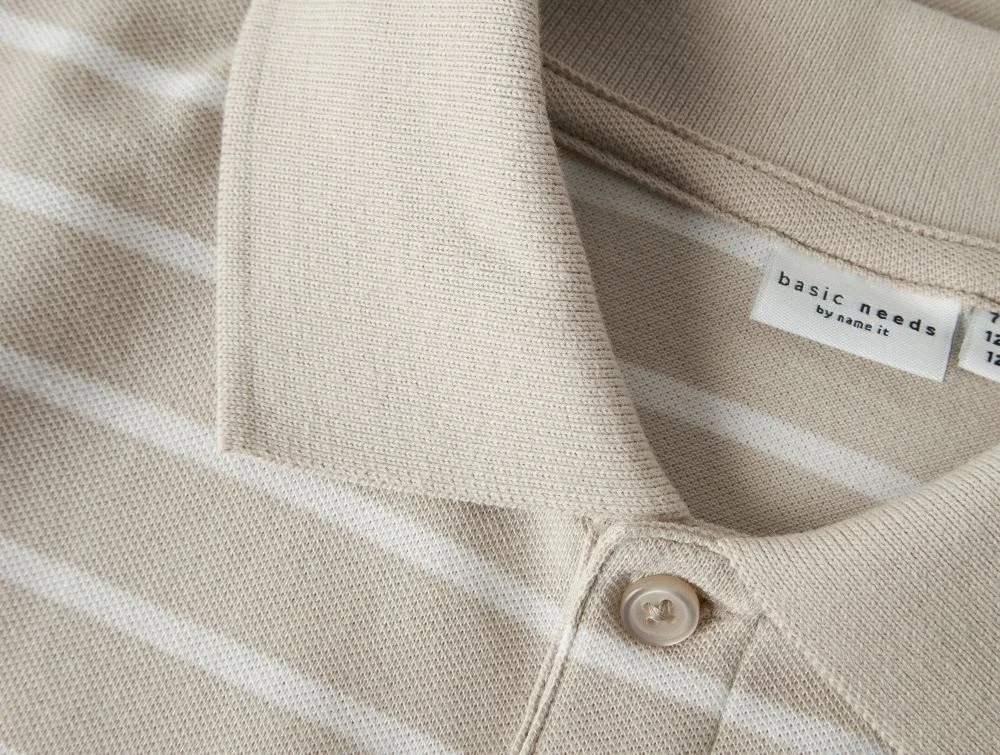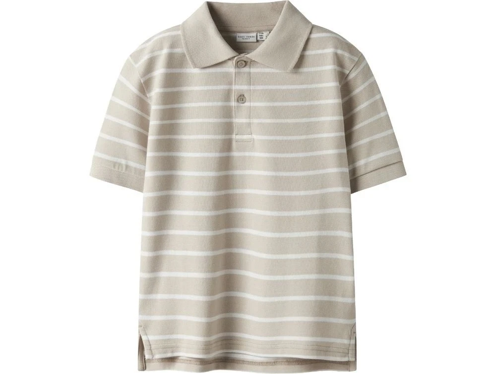 Klassisk og komfortabel polo T-shirt fra Name It i beige med hvide striber. T-shirten er lavet i en blød piquékvalitet med en let vaffelstruktur, der giver et stilfuldt og tidløst udtryk.