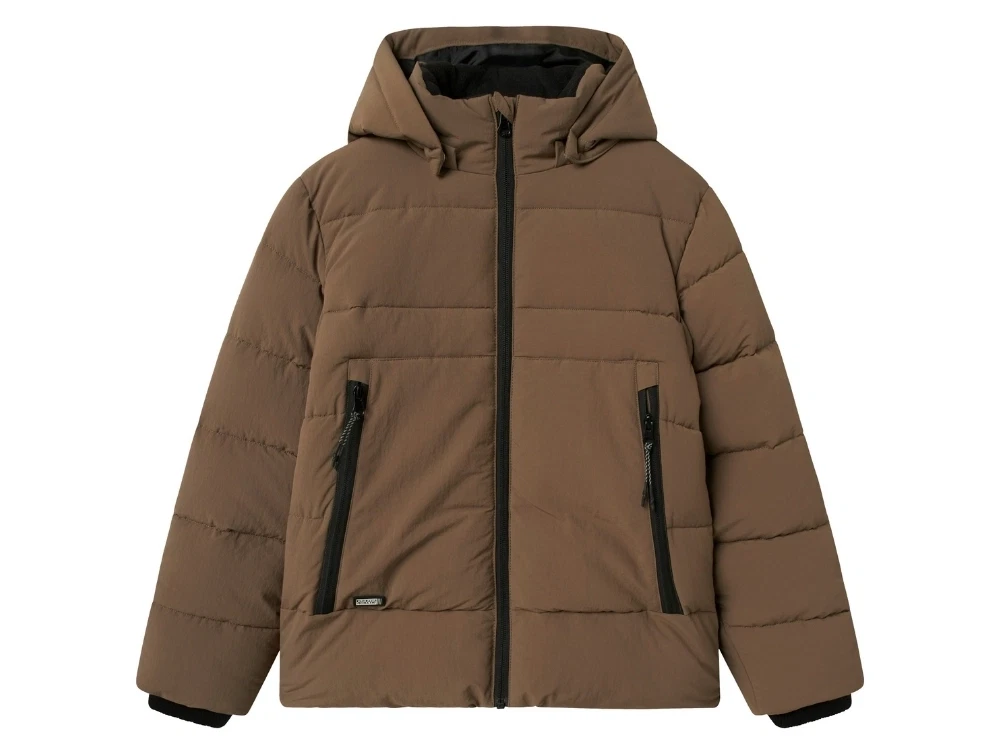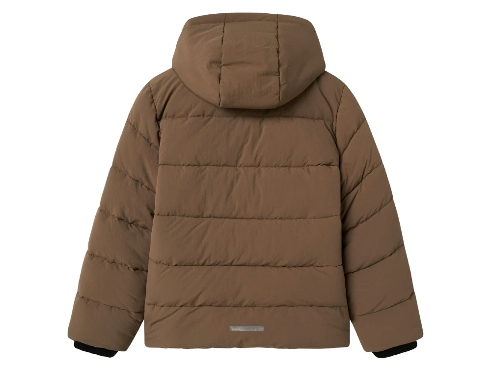 Name It pufferjakke brun til børn med aftagelig hætteDreng iført Name It brun pufferjakkeDetalje af brun Name It pufferjakke med hætteLynlås og lomme på brun Name It pufferjakkeBagside af brun Name It pufferjakke med hætte
