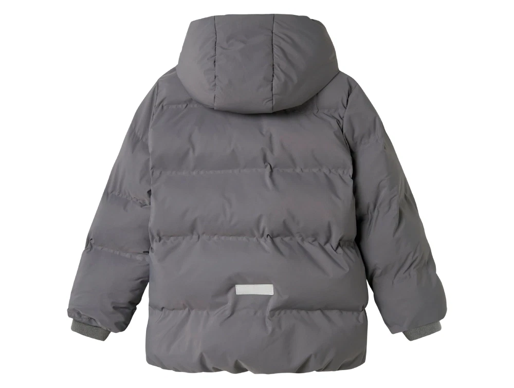 Barn iført grå Name It pufferjakke quiet shakeName It pufferjakke grå quiet shake til børn med aftagelig hætteDetalje af aftagelig hætte på grå Name It pufferjakke quiet shakeLomme med knaplukning på grå Name It pufferjakke quiet shakeBagside af grå Name It pufferjakke quiet shake med refleks