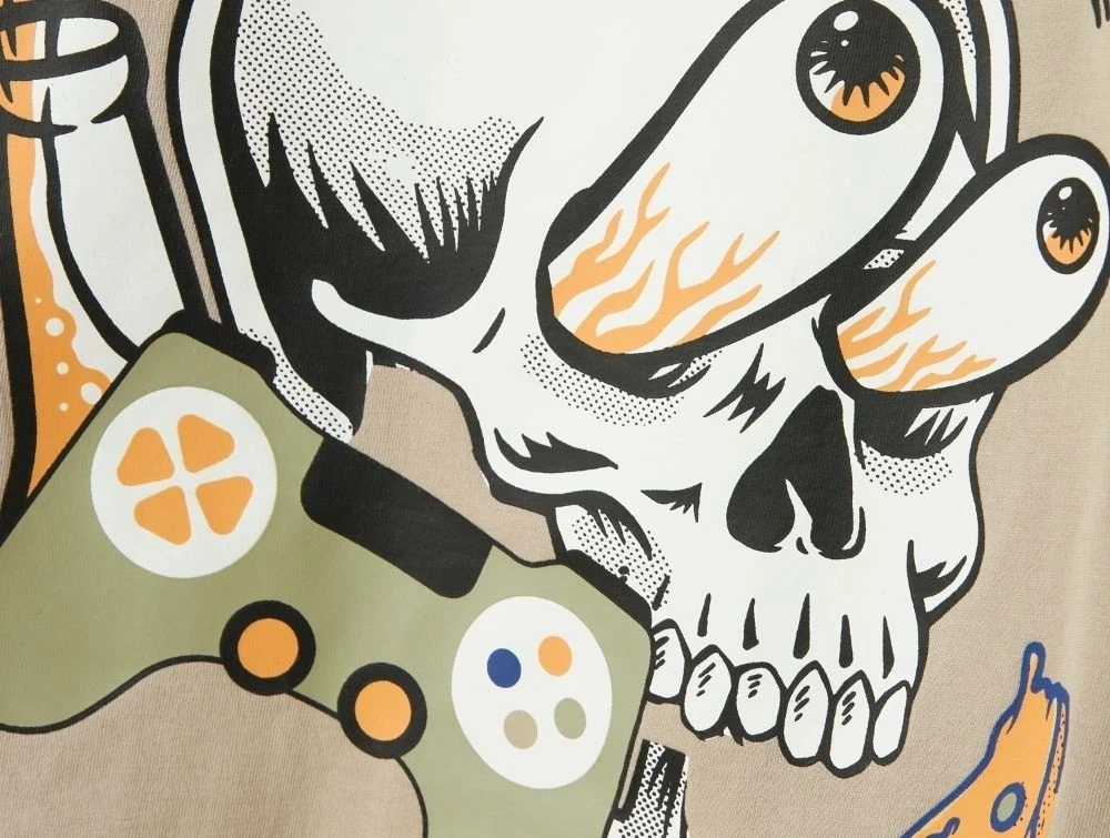Sandfarvet t-shirt fra Name It med cool gamerprint på både front og ryg.