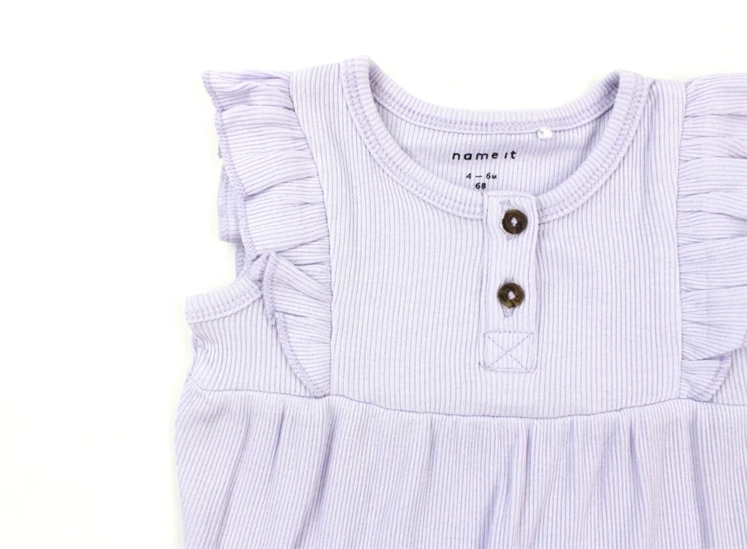 Heldragt i rib med flæser på skuldre i økologisk bomuld fra Name It.