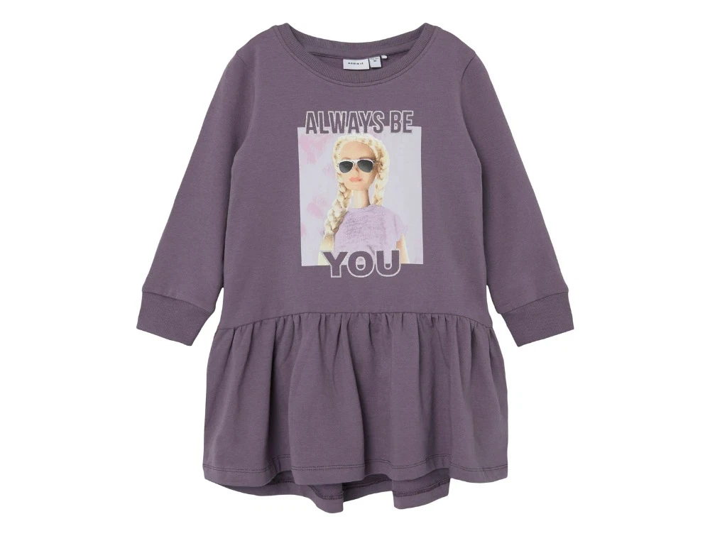 Sweatkjole i farven purple sage med Barbie-print fra Name It.
