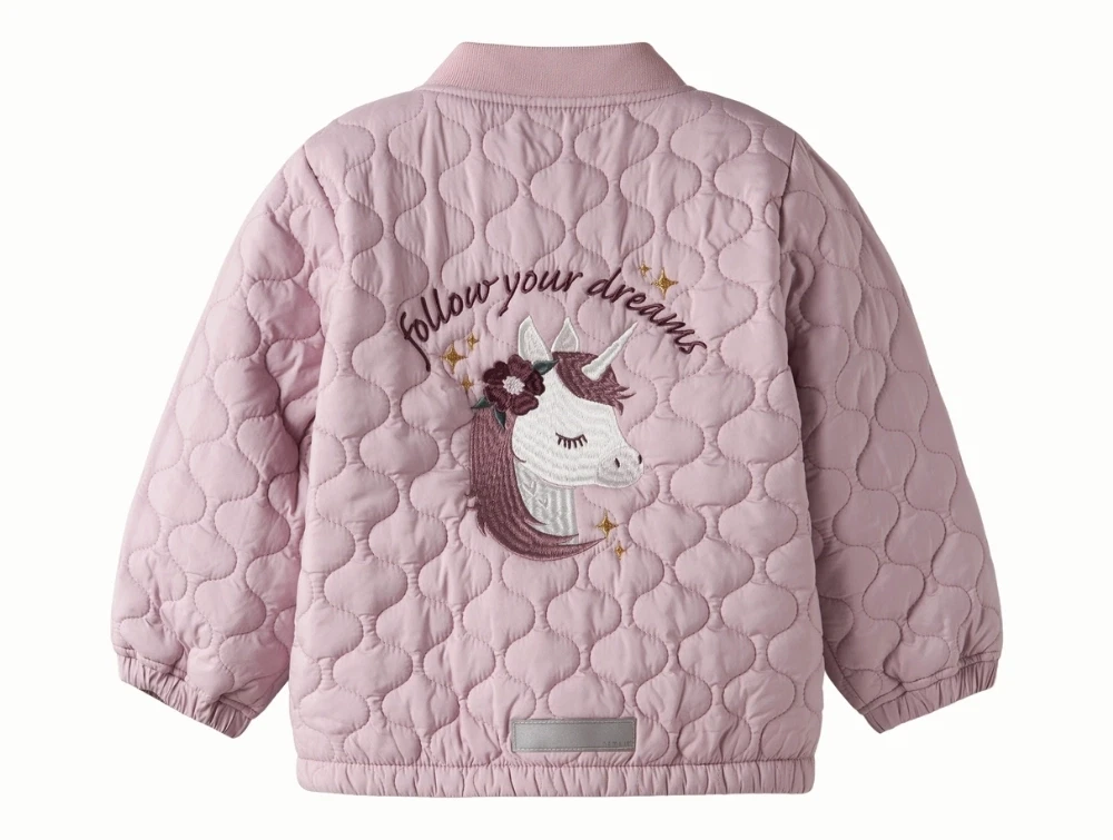 Name It quiltet jakke i rosa nuance på barnName It quiltet jakke set bagfra med enhjørningbroderiName It quiltet jakke i rosa nuance med hjertebroderiName It quiltet jakke med broderede hjerterName It quiltet jakke med refleks