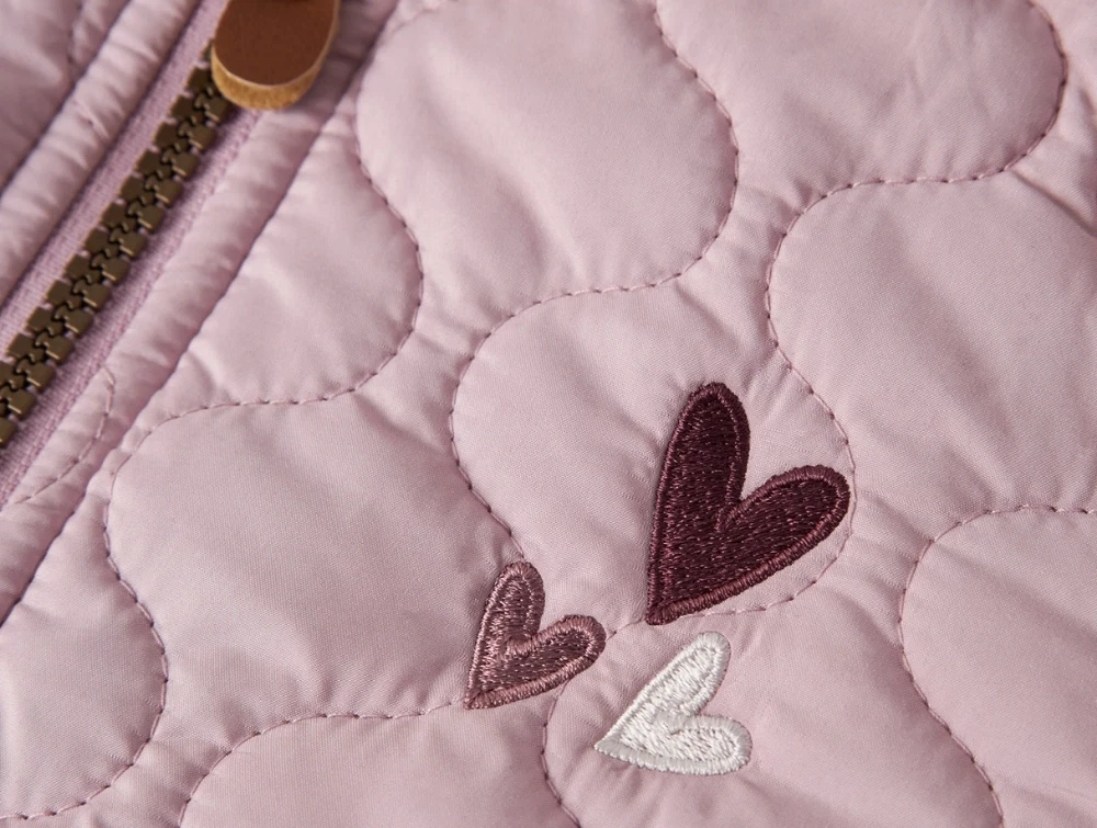 Jakken lukkes med lynlås og har ribkant ved halsen samt elastik ved ærmeafslutningerne, som hjælper med at holde kulden ude. Sidelommer giver plads til små hænder. Den quiltede konstruktion giver en let isolering uden at virke tung.