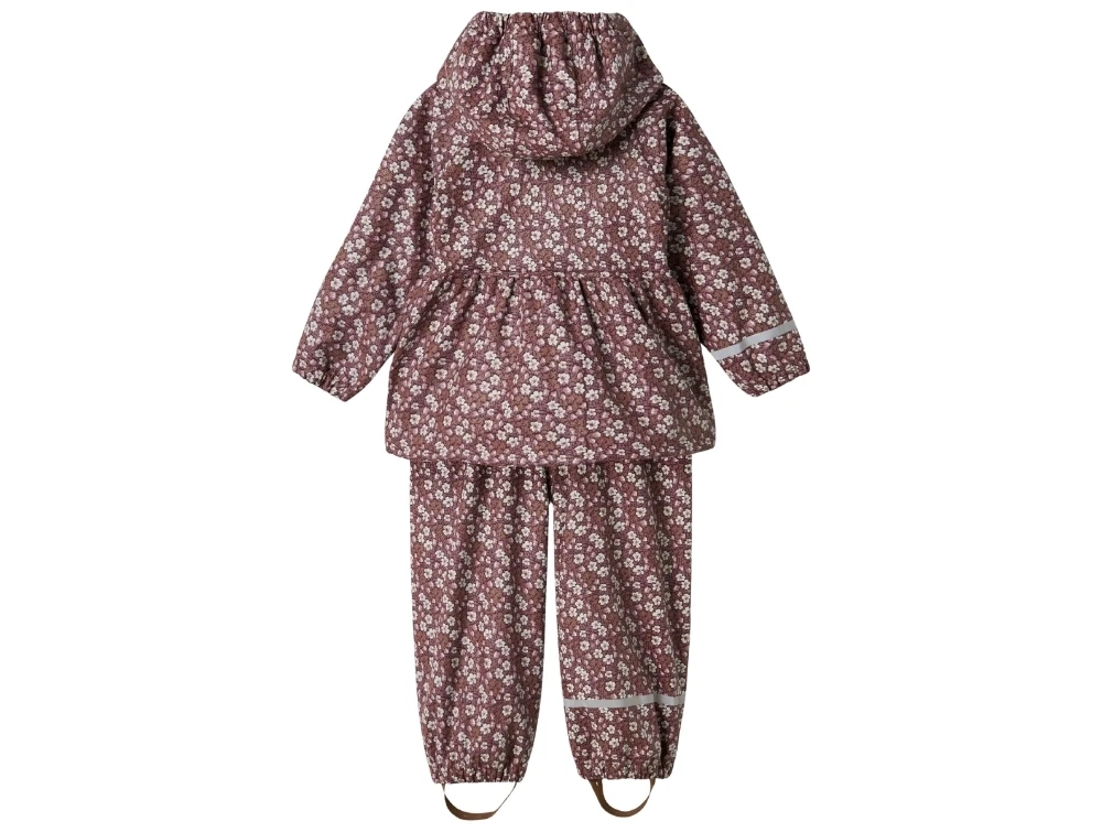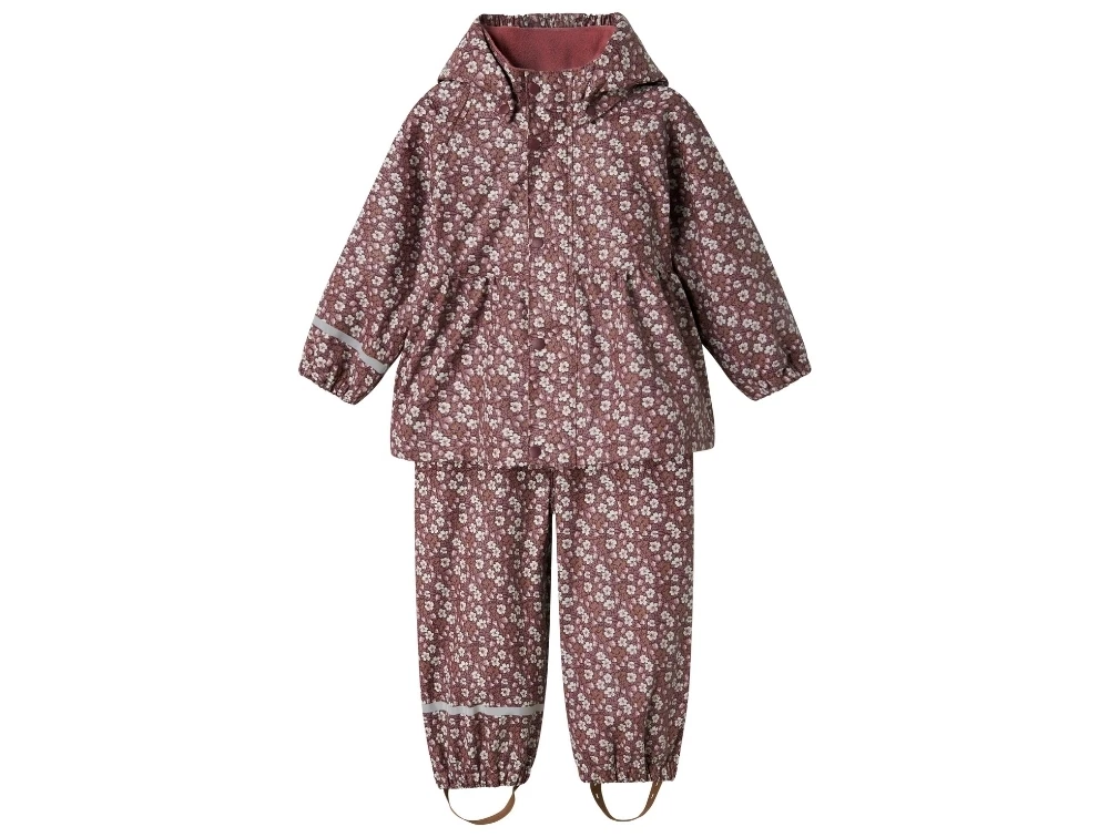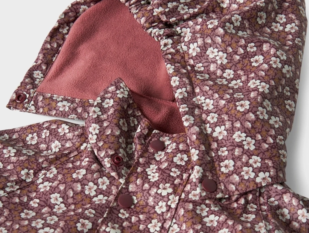 Regnsæt i violet nuance (fig) fra Name It med dekorativt blomsterprint og blød fleece indvendigt ved kraven.