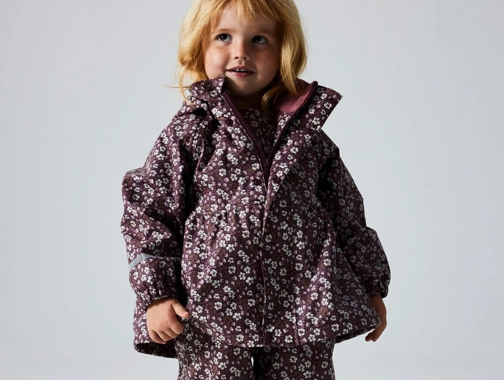 Barn iført Name It regnsæt med blomsterprint i fig farveName It regnsæt i violet med blomsterprint set forfraName It regnsæt i violet med blomsterprint set bagfraName It regnbukser i fig med blomsterprint og selerDetalje af hætte og krave på Name It regnsæt med blomsterprint