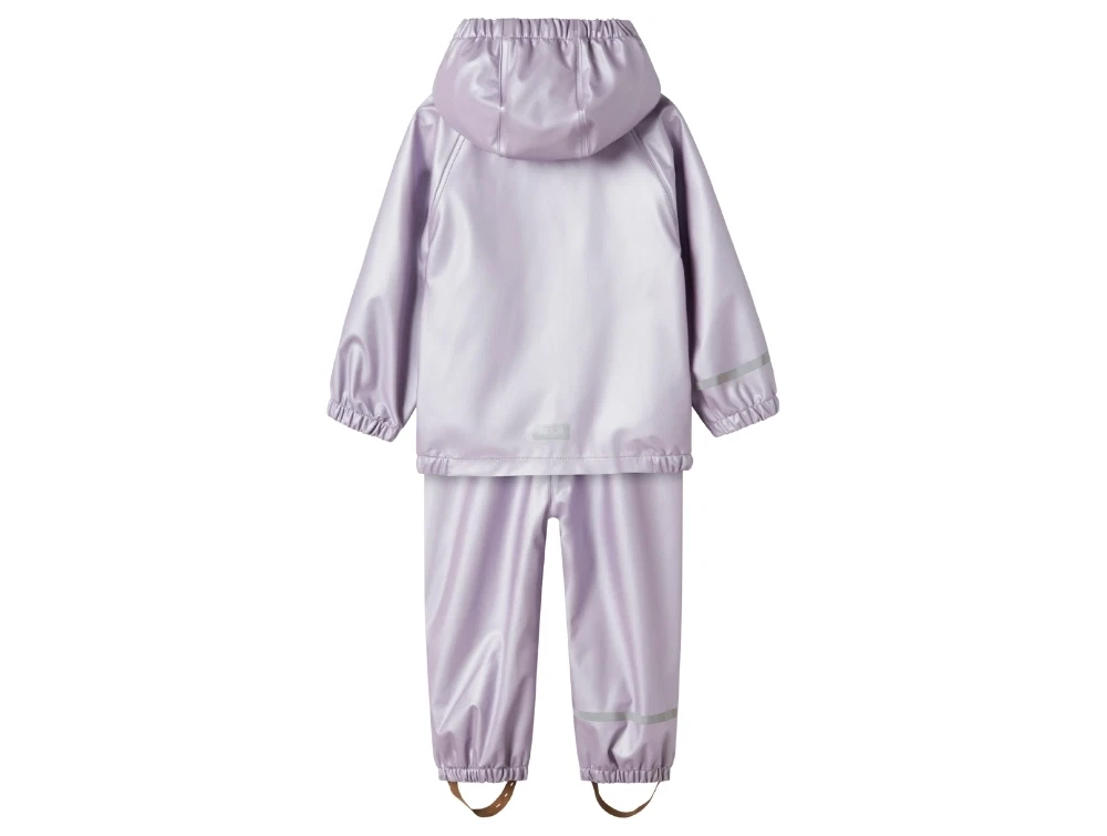 Regnsæt i metallisk lilla nuance (misty lilac) fra Name It med praktisk aftagelig hætte og refleksdetaljer på ærmer og ben.