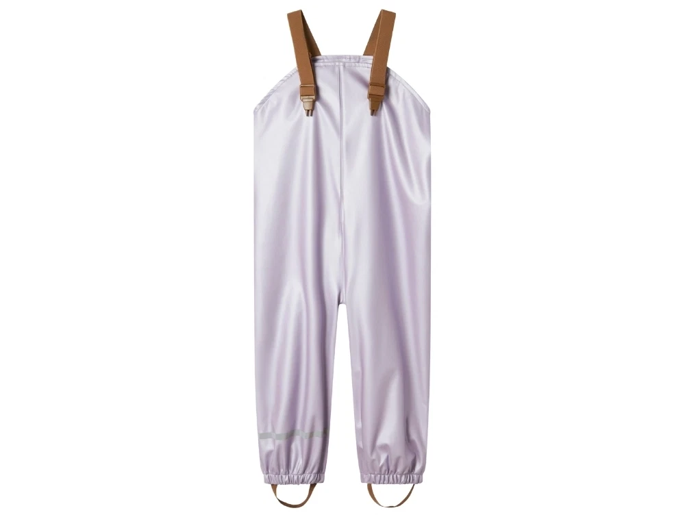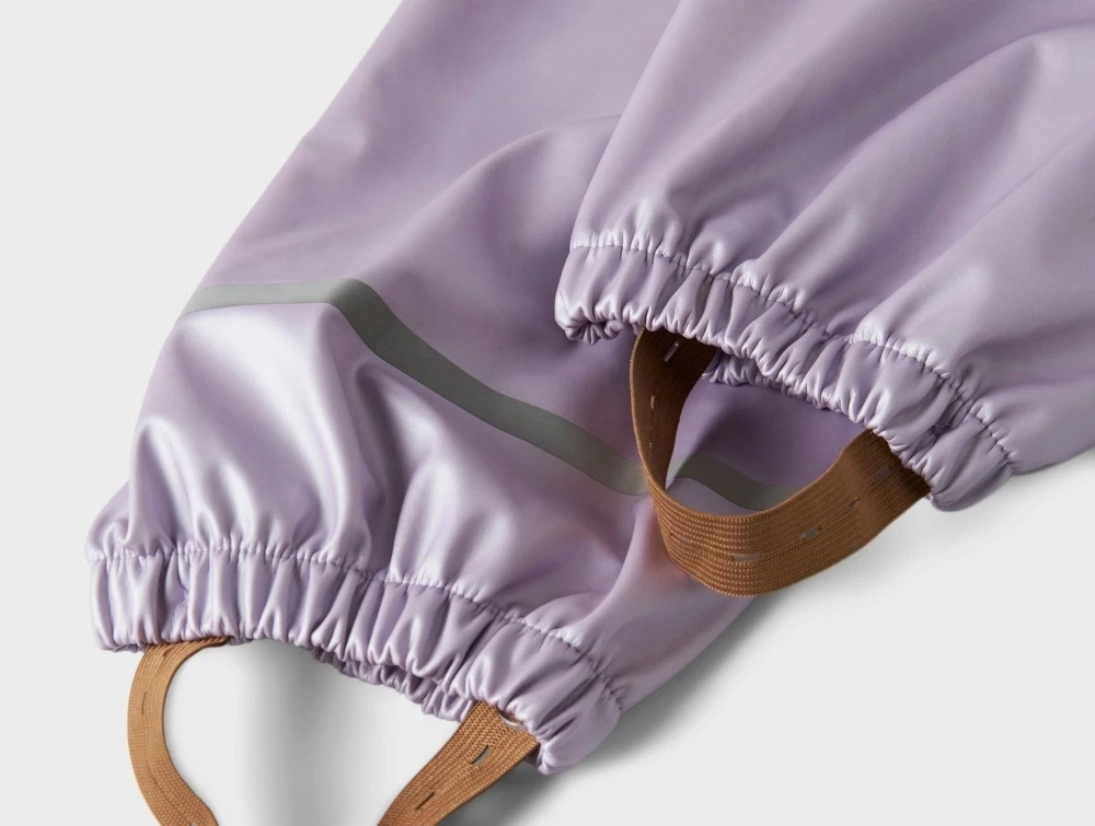 Name It regnsæt i lilla set forfra med hætte og reflekserName It regnsæt i lilla set bagfra med hætte og reflekserName It regnbukser i lilla med seler og elastik ved anklerneDetaljebillede af Name It regnbukser med fodstropper i lillaDetalje af hætte og krave på Name It regnsæt i lilla
