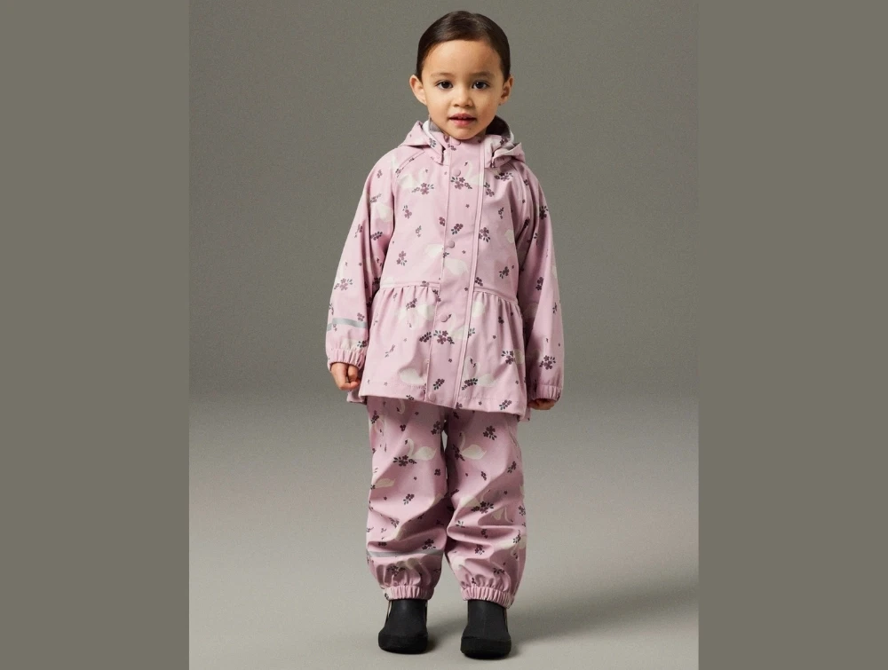 Regnsæt i lyserød nuance (keepsake lilac) fra Name It med allover svaneprint.