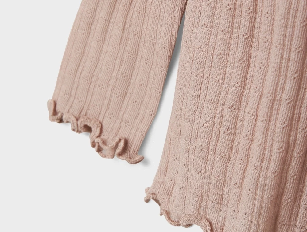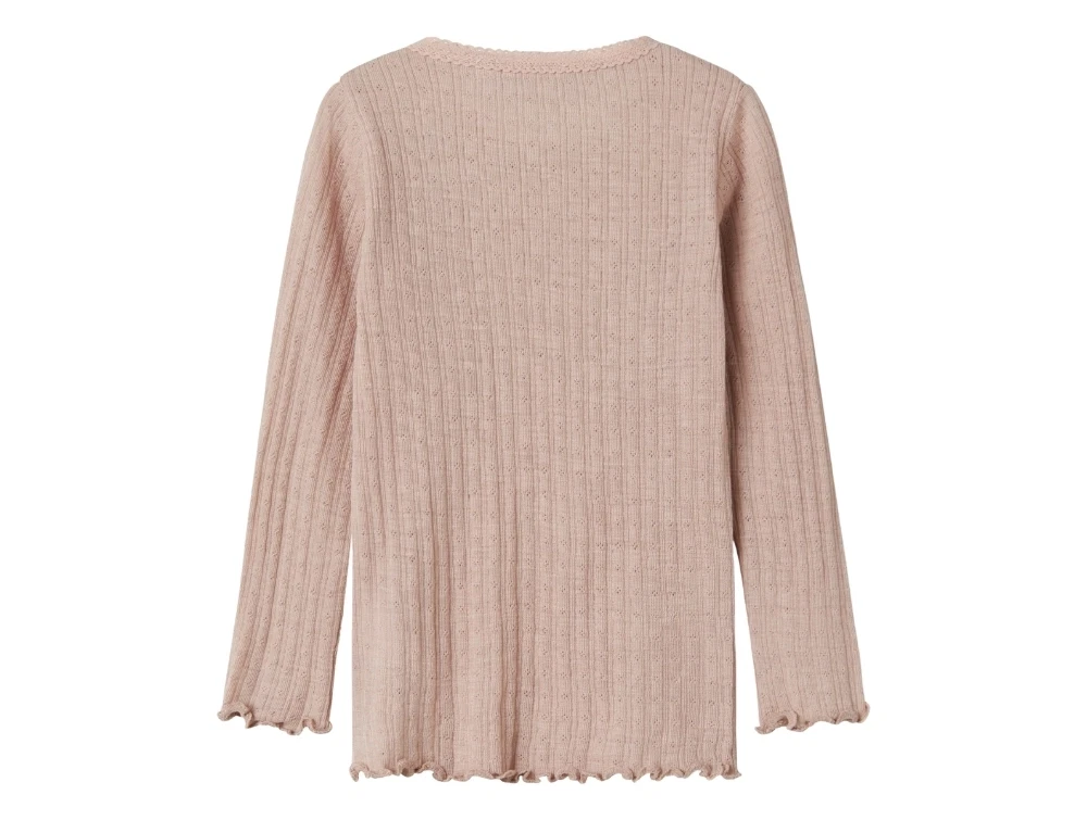 Name It rib bluse i støvet rosa nuance med hulmønster i merinould og silke