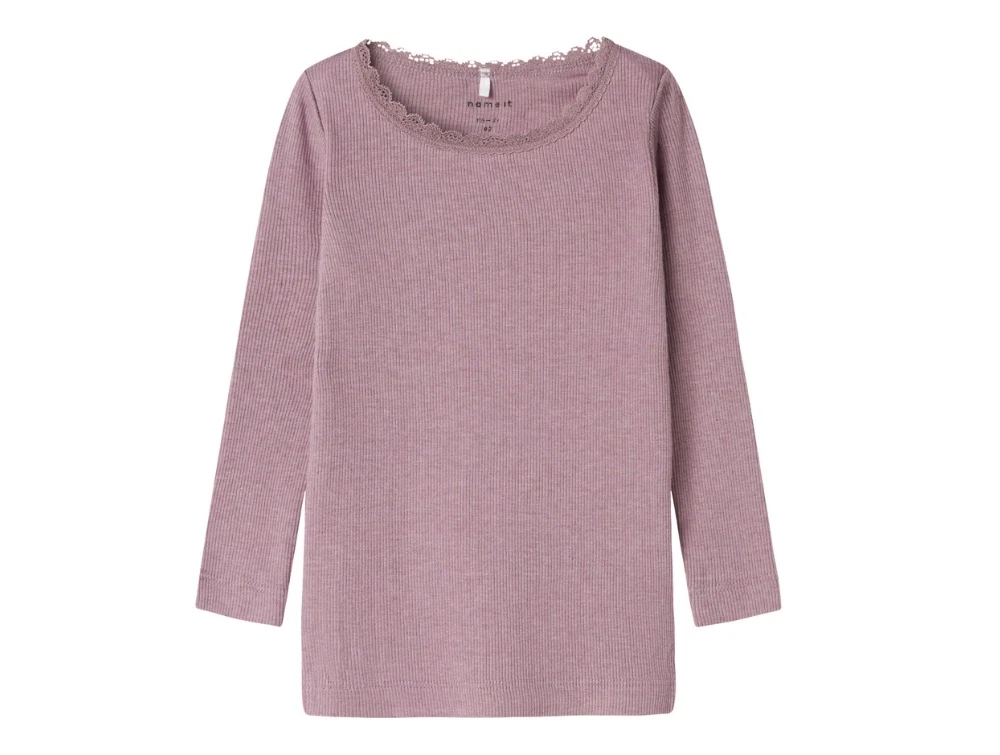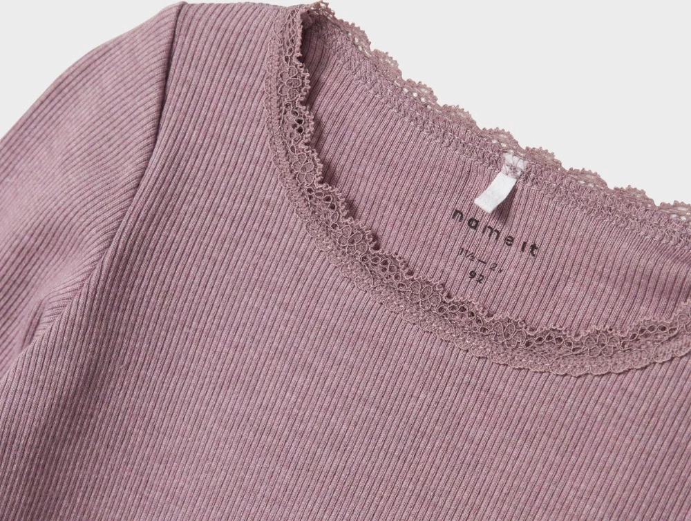 Ribbluse i støvet lilla nuance fra Name It. En klassisk langærmet bluse i blød, strækbar rib med rund hals og fine blondekanter, der giver et feminint udtryk.